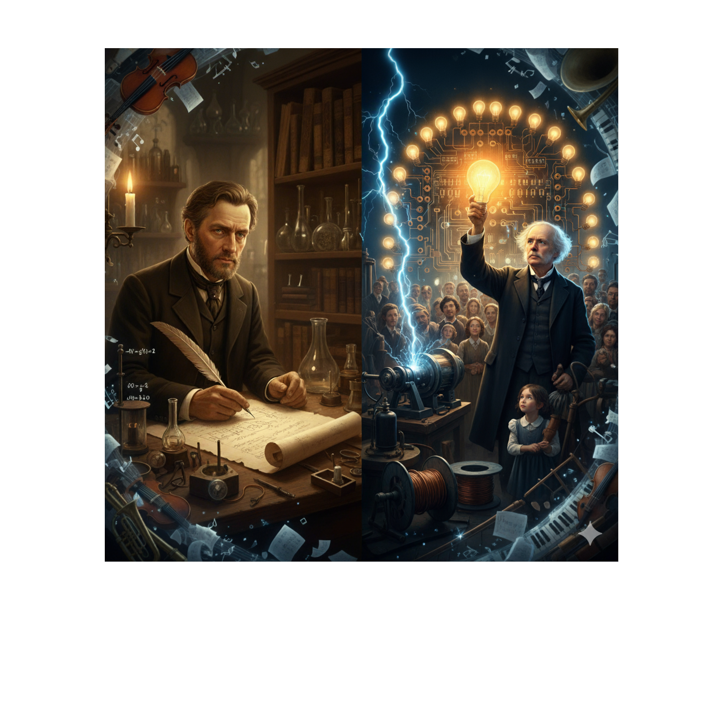 Dynamics: Begin intimate with candlelit lab, ambient candle flicker, soft lab creaks, faint electrical hums; build gradually through struggle, discovery, and duets; crescendos at “Ohm’s law flows, Edison ignites”; final duet full orchestral swell; end softly with lingering emotion, fading piano, strings, and candle flicker