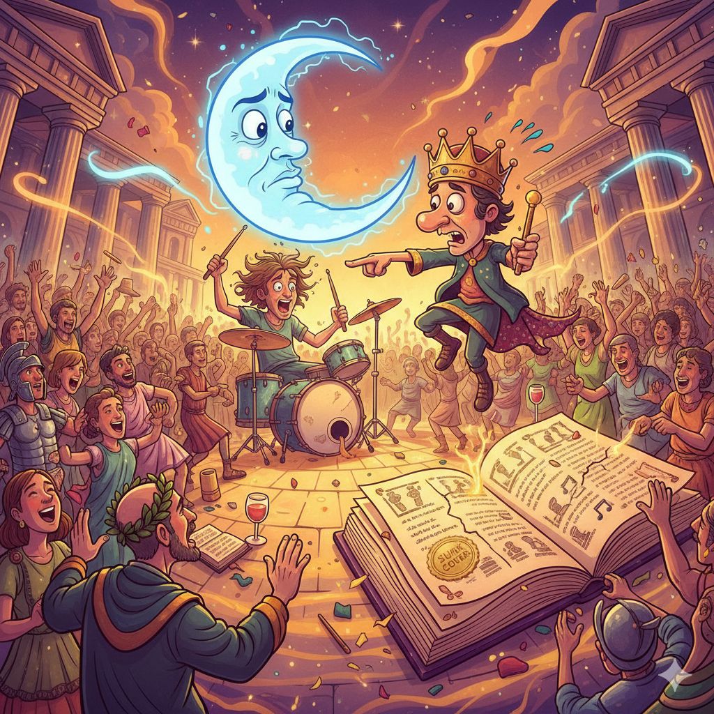Ultra-high-fidelity cinematic pop; crystal vocal clarity; expressive phrasing; tight rhythmic delivery; clean consonants; stacked harmonies and doubles; subtle whisper layers, Style: orchestral-pop with funky modern groove; pizzicato strings for humor beats; brass stabs for dramatic punch; shimmering pads; light plucks; warm analog bass; tight drums with syncopation, Arrangement: smooth lift into choruses; theatrical comedic hits inspired by Nero/Leo themes; dynamic breakdown with filtered drums; wide final chorus, Mix: pristine stereo width; bright top-end sparkle; deep but clean low-end; sharp transient definition; controlled cinematic reverb; short rhythmic delays, Mood: witty, elegant, clever; historical comedy reimagined as high-end pop