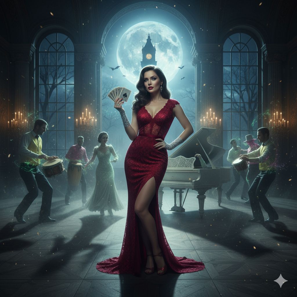 Halloween dance anthem, playful gothic, energetic mid-tempo groove, 124 BPM, Four-on-the-floor kick, off-beat snare, hi-hat swing; Synth lead + pad, cello strings, subtle organ, bass groove, playful percussion; FX: bat wings, ghost laughter, pumpkin pop, whispered effects, creaking doors, footsteps; Dynamics: suspenseful intro, playful verses, energetic choruses, crescendo bridge, full-climax final chorus; Vocal: seductive, husky, airy, teasing, call-and-response included; Hook: addictive, minor-major mix, micro-rhythm variations; FX Integration: synchronized with kick/snare/hi-hat and Hook, layered for climax; Groove: max body movement, all FX tightly synced, rhythm variations in chorus and final chorus; Timeline: Intro 0:00-0:20, Verse 1 0:20-0:50, Pre-Chorus 0:50-1:10, Chorus 1:10-1:40, Verse 2 1:40-2:10, Bridge 2:10-2:30, Final Chorus 2:30-3:00; Goal: catchy, FX-driven, instantly memorable Halloween party anthem with sexy vocal energy and maximum groove