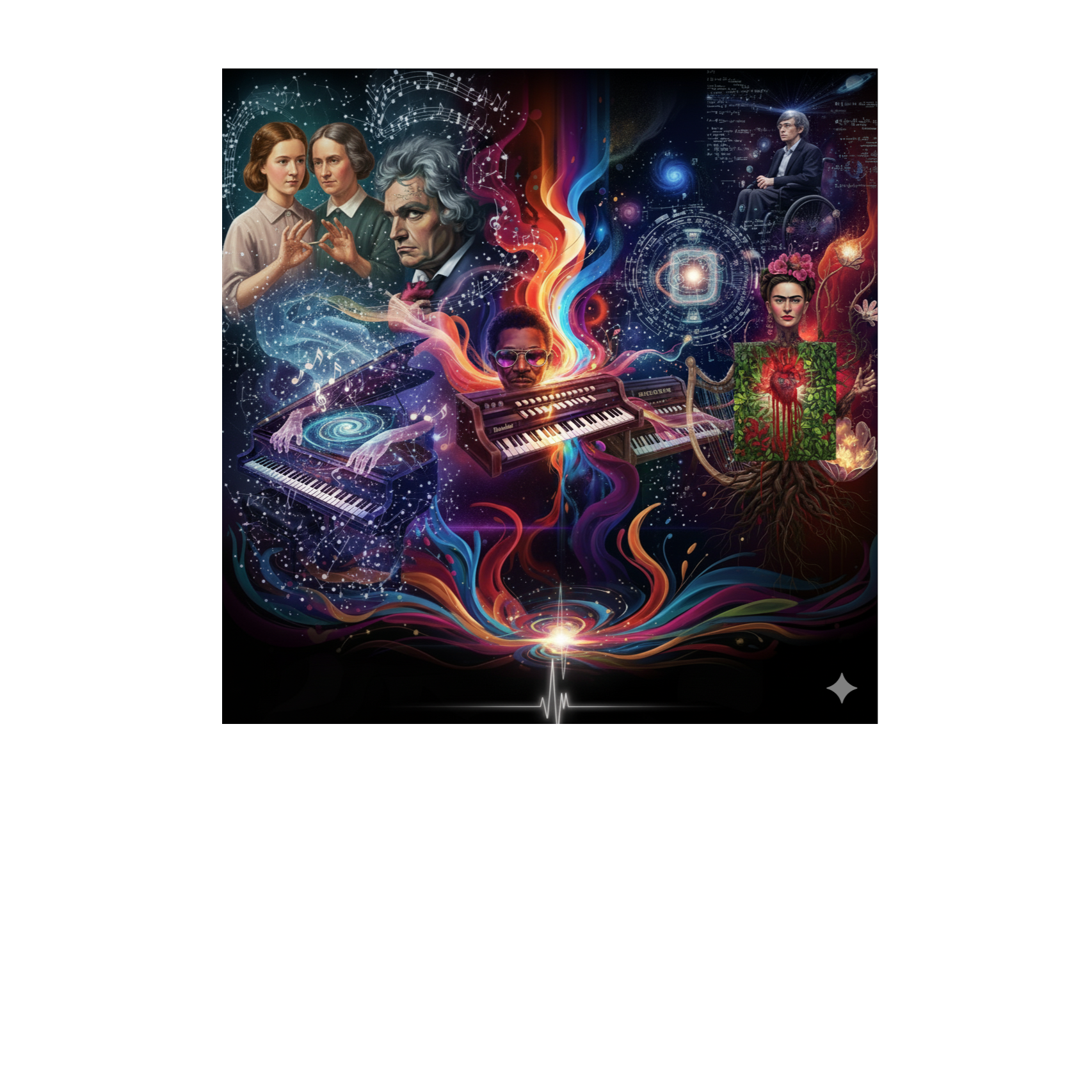 7-minute music for Helen Keller (blind & deaf), Beethoven (deaf), Ray Charles (blind), Stephen Hawking (physical limitation), Frida Kahlo (chronic pain), High-quality audio, dynamic, spatial depth, tactile lows, 0:45–2:00 Helen Keller: staccato piano, tactile percussion, whispers, spatial effects, emphasize tactile perception, 2:00–2:45 Beethoven: bowed/distorted piano, choir whispers, sub bass, focus on inner hearing, 2:45–3:30 Ray Charles: Rhodes, organ pads, brushed percussion, soulful vocals, synesthetic tactile experience, 3:30–4:15 Stephen Hawking: synth pads, arpeggios, robotic vocals, sub pulses, cosmic/mind textures, 4:15–5:00 Frida Kahlo: strings, harp arpeggios, percussive hits, emotive vocals, express physical/emotional pain, 5:00–6:45 Chorus: orchestra, choir, synth pads, percussion, integrate all themes, layered dynamics, spatial depth, 6:45–7:00 Outro: minimalist heartbeat, fade to silence, high-quality audio, dynamic expressiveness, tactile lows