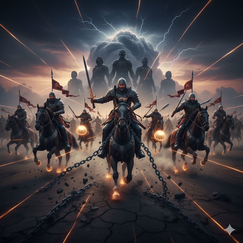 Extreme power metal, male lead vocal max high belt, harmonies x6, central Asian & Indian ornamentation (gamak, meend, micro-melisma), aggressive off-beat phrasing, micro-timing vocals, 보컬 리듬 항상 주도, Full instrumentation: distorted guitars (palm-muted, shredding, epic riffs), double-kick drums maxed with fills, tom rolls, tablas syncopation, layered synths (arpeggiated pulses, saw leads), punchy bass, stereo ±30°, desert wind atmosphere, galloping rhythm, Song structure: Intro, Verse 1, Pre-Chorus 1, Chorus 1, Verse 2, Pre-Chorus 2, Chorus 2, Bridge, Instrumental Break, Final Chorus, Outro, Extreme dynamic swells, layered backing harmonies, Hook + Call & Response, 5-minute runtime, maximum amplitude, epic steppe cavalry inspiration, unchained, relentless, heroic, no onomatopoeia, fully power-driven, explosive rhythm and impact, High-quality mix: EQ 2–5kHz boost, compression 2–3:1 fast attack/moderate release, LUFS -8~-9, limiter -0, 1dBFS, punch and clarity maximized