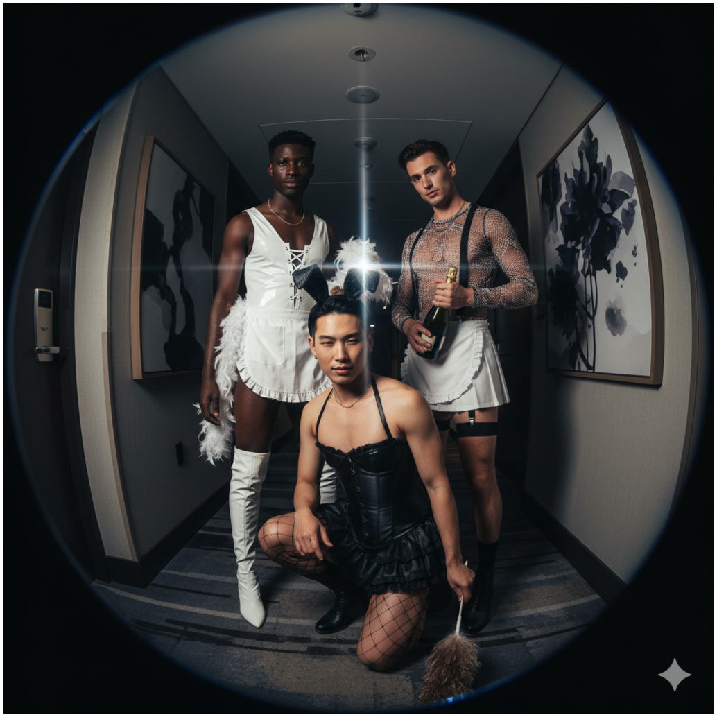 A high-energy 2010 Dance-Pop-Rock song for an adult boy group, Upbeat Dance-Pop with Pop-Rock and Dance R&B influences, Four distinct male voices (Zu, Ken, Ash, Fred), aged early to mid 20's, with sultry, clear and confident tones, Zu is the front singer with a rich, smoky, commanding contralto delivery and sultry vibrato; Ken brings a bright and soaring mezzo-soprano with rock-grit; Ash is the wild card punk boy, fiery and energetic; Fred's voice is deep, a smooth bass, playful with a sensual tone, Incorporate tight harmonies and call-and-response sections to highlight their friendship and group dynamic, The song is playful, infectious, and celebrates desire, The vibe Dance-Pop, with chants and a catchy, shout-along chorus, The lyrics are about sneaking out, breaking rules, and getting laid, Include harmonies, a punk-rap breakdown, and a chant-like outro, The tempo is upbeat (around 120-130 BPM), with bright synths, punchy drums, and a melody thatās easy to sing along to