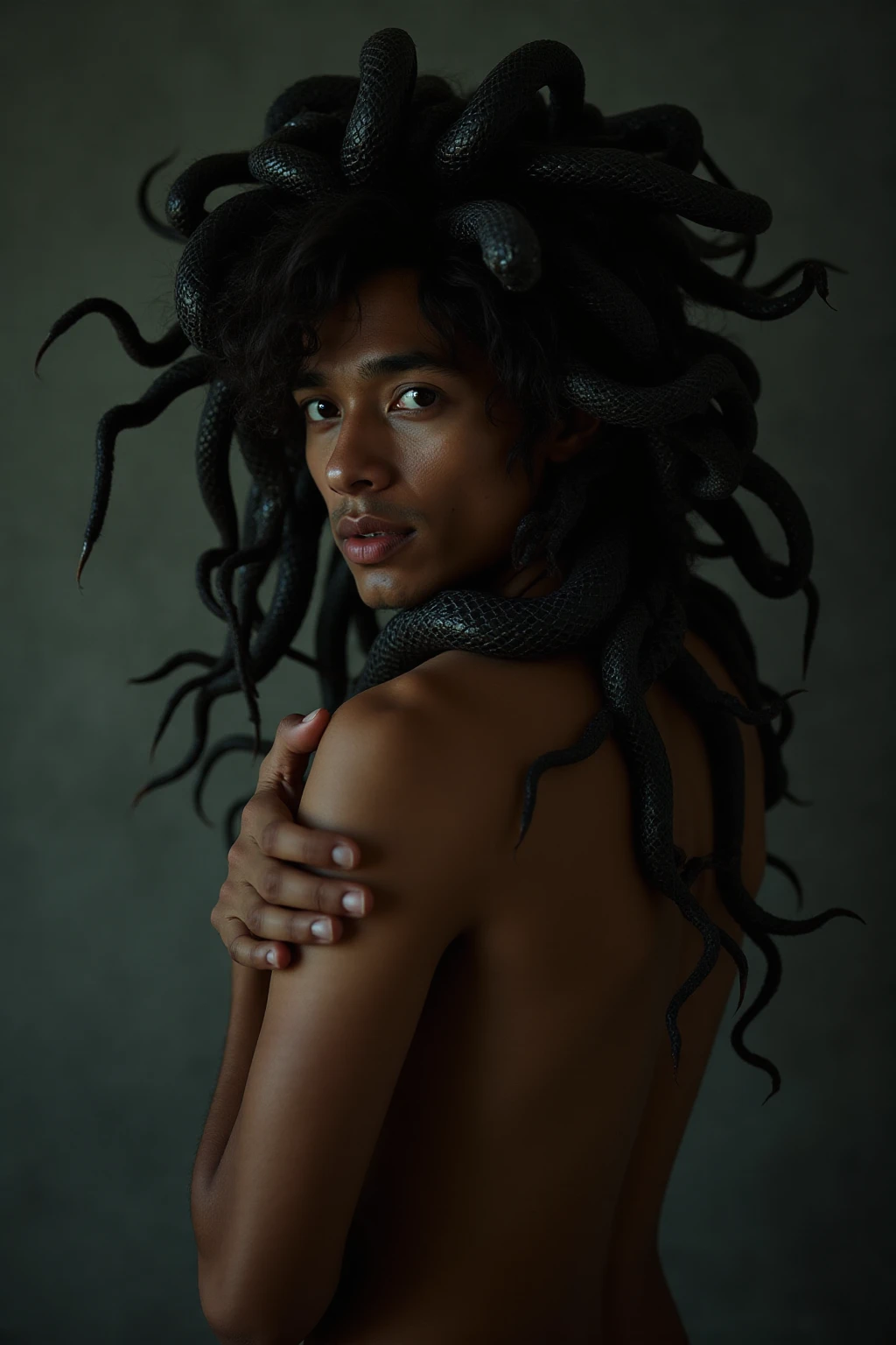 Dark World Fusion (Mid 2010s Techno/House influence) with Carnatic indian Hyperpop, The mood is seductive, mystical, and intensely primal, building to a high-energy, ecstatic climax, The tempo starts slow (approx, 70 BPM) and accelerates gradually, driven by a persistent, heavy 'heartbeat' kick drum rhythm (De-Dum De-Dum) overlaid with complex Indian percussion (Tabla, Kanjira), Instrumentation features dark, sweeping analog synth pads, hypnotic Sitar or Santoor riffs, and deep, evolving sub-bass lines, Male vocals are sensual and breathy, singing in a fictional Dravidian-like fantasy language, Carnatic samples