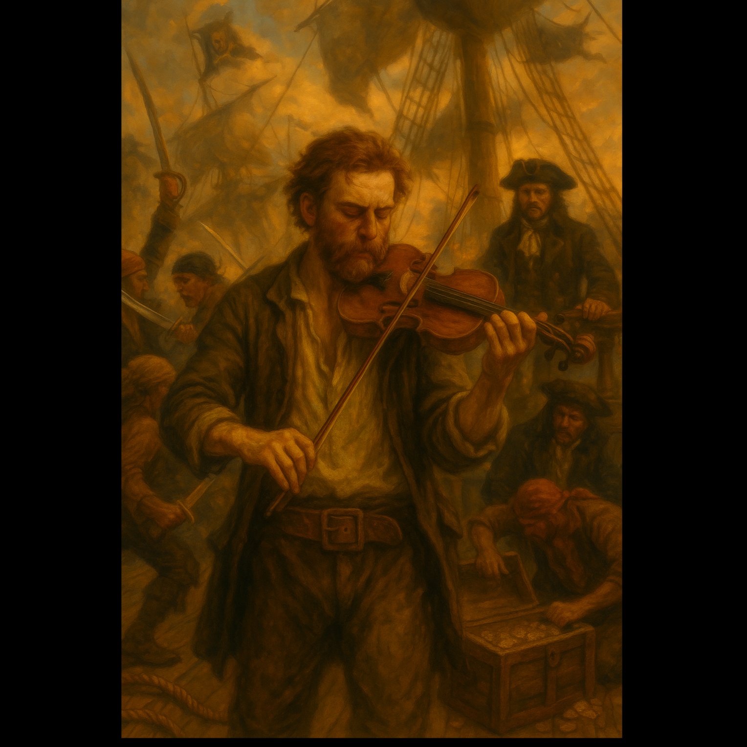 Sea shanty-style pirate song with storytelling verses and rebellious, anti-establishment tone, Fast tempo, acoustic instrumentation (fiddle, drums, accordion), male vocals, Style: half sea shanty, half folk anthem, For a devil-may-care sailor with nothing to lose