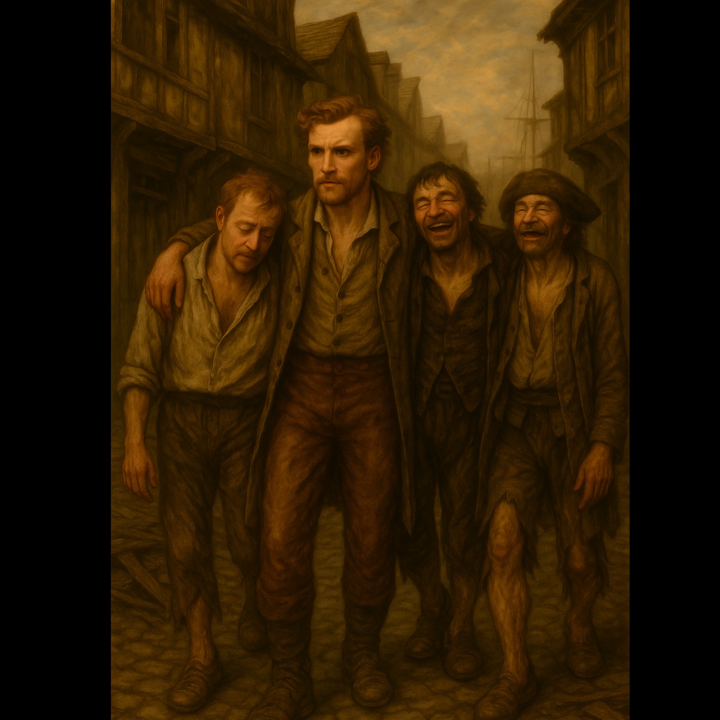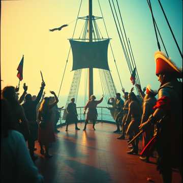 High-energy, theatrical sea shanty-style song with a comedic and rebellious tone, Male vocals, fast tempo, rhythmic acoustic instrumentation (accordion, fiddle, hand percussion, upright bass), Style inspired by ‘A Whale of a Tale’ from 20, 000 Leagues Under the Sea—each verse describes a colorful pirate crewmate with over-the-top flair and punchline endings, Sung by a devil-may-care sailor freshly inducted into a pirate crew