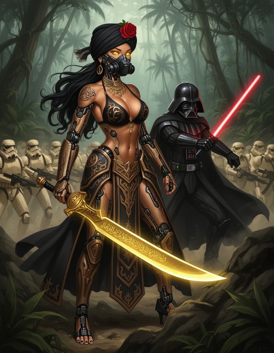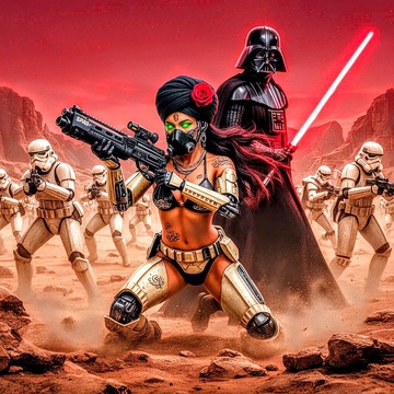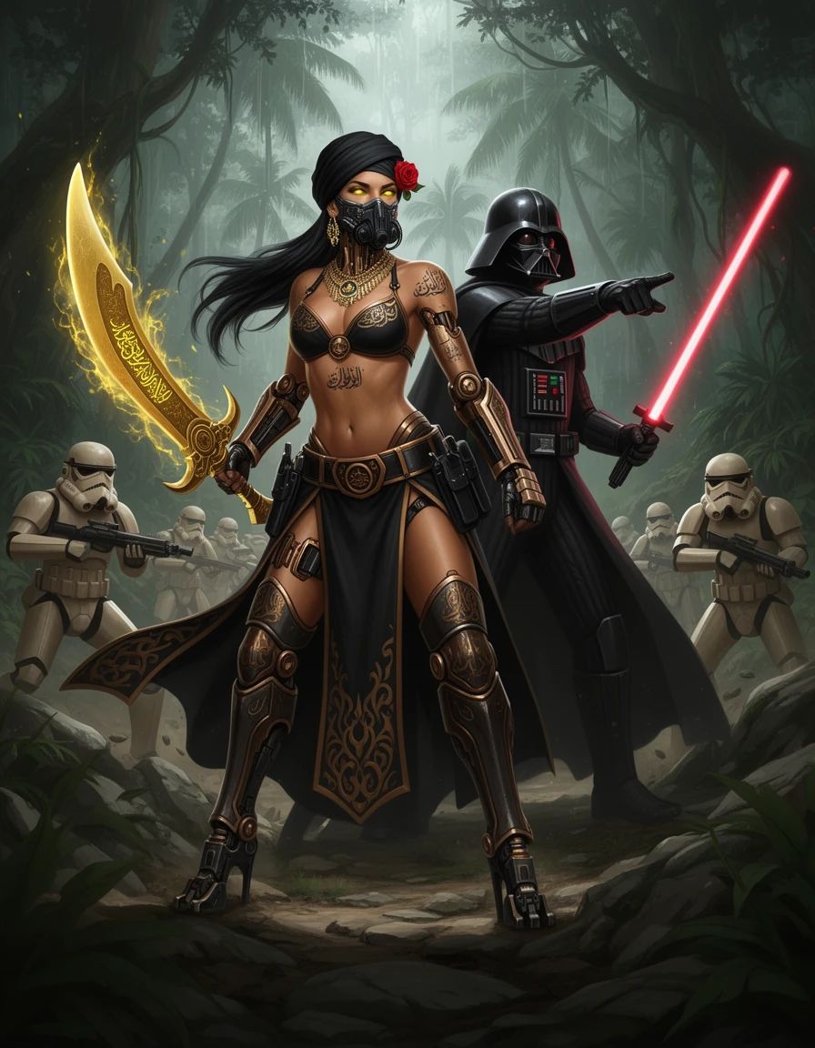 Ochestral cinematic score characterized by aggressive fanfares in rythm and in sync with all the metal genres, composition high-intensity staccato strings and aggressive brass fanfares, The piece features a rapid tempo with a driving 4/4 rhythm, utilizing heavy orchestral percussion features a fast-paced, driving tempo with complex percussion including timpani rolls, brutal death metal providing a sense of a intense battle while low-end brass establish a militaristic foundation, frequent use of dissonant clusters and chromatic shifts to heighten tension, powerful death metal, intense brutal death metal, industrial metal, speed metal, nu metal, 80s thrash metal, syncopation create a sense of chaotic battle and urgency, power metal, black metal, doom metal, death core, guitars shredding and intense riffs with soaring thrash guitars, rhythm guitars, non stop speed, minor pentatonic, natural minor, and Phrygian dominant scales, futuristic