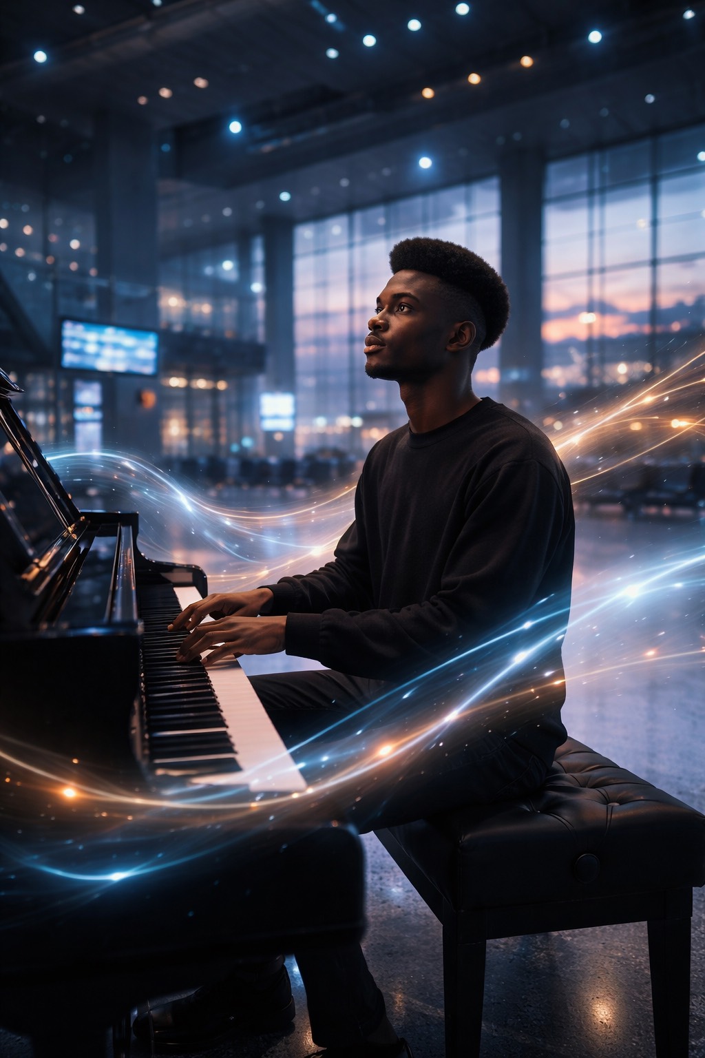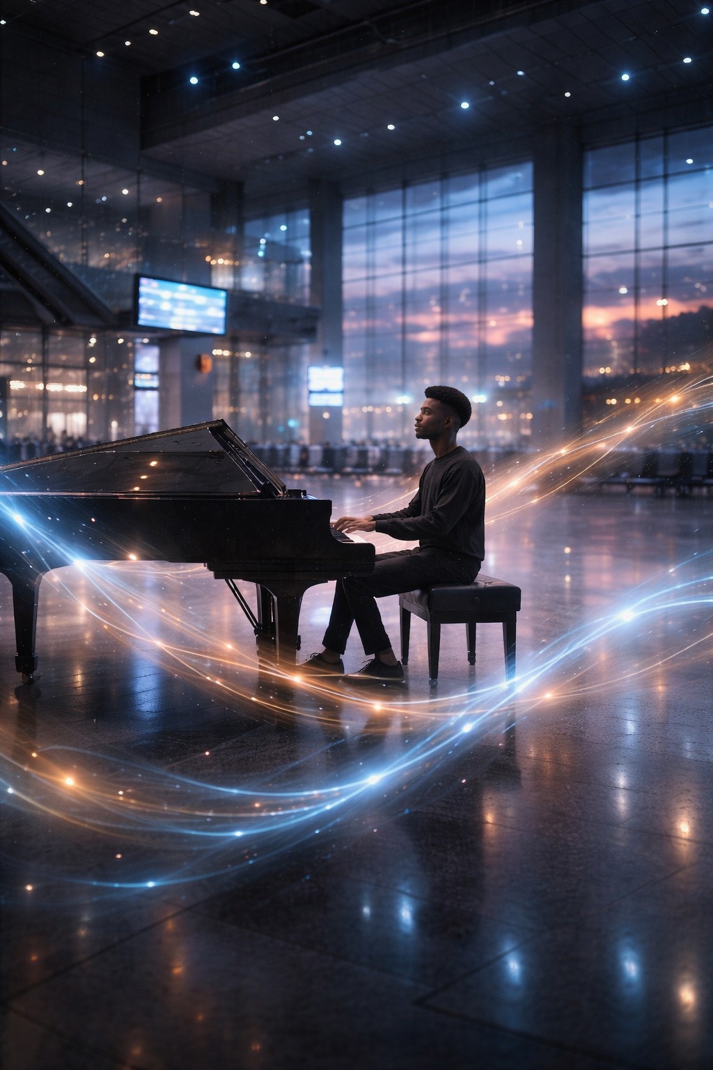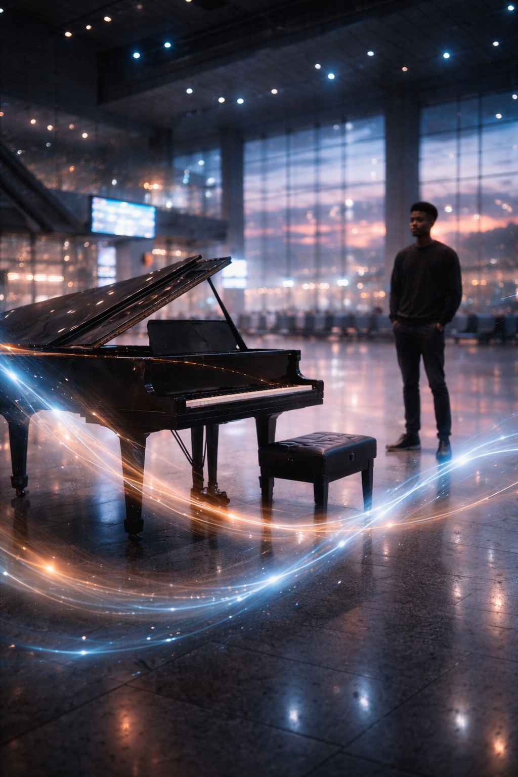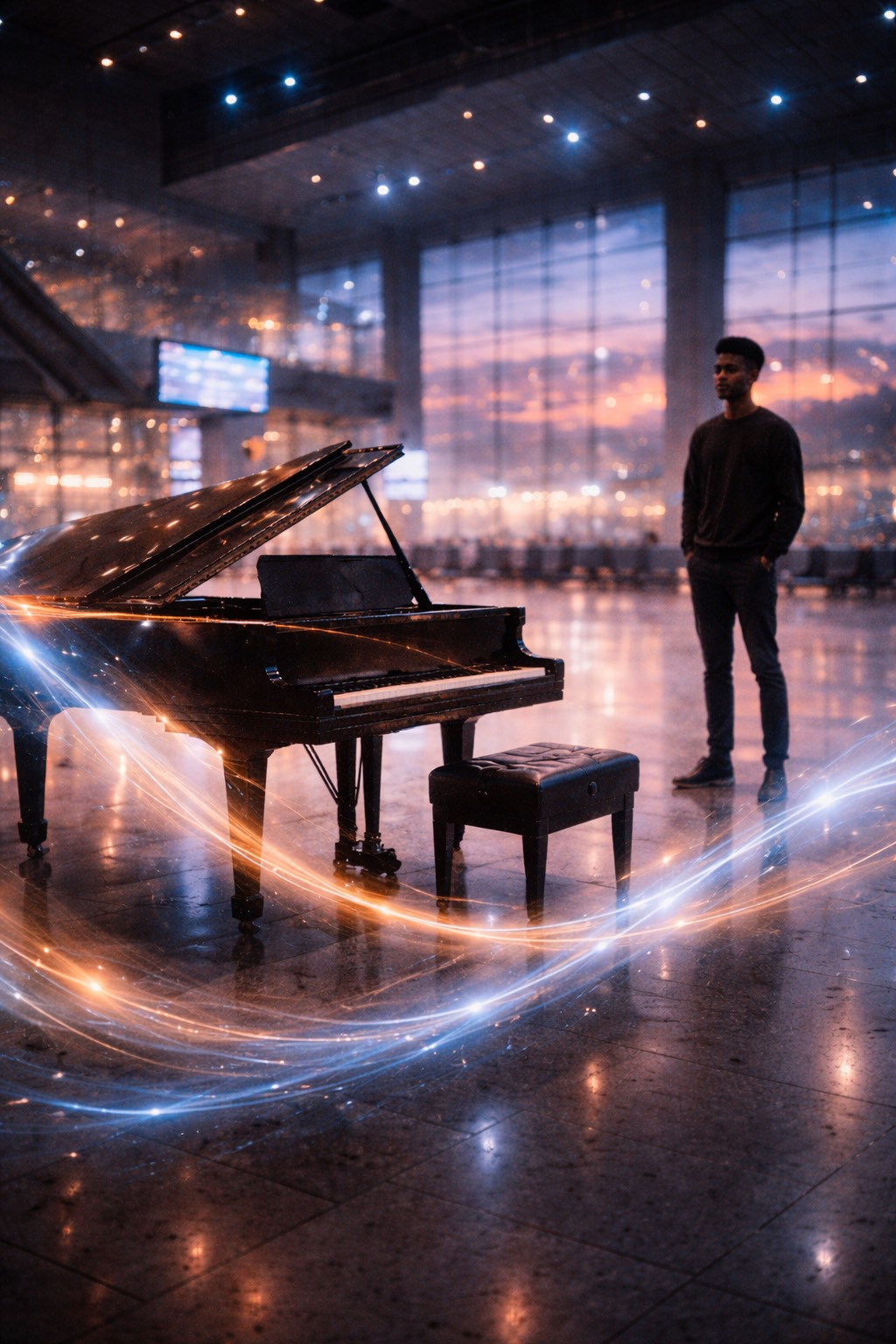 Cinematic piano-led composition set in a large public interior space such as an airport terminal, with natural room tone and ambient presence preserved, The piano remains front and center, intimate and resonant, anchored by deep low-register notes, Gradually introduce subtle orchestral elements — low strings (cellos and basses) as sustained harmonic support, with soft violas and high strings entering very late for gentle emotional lift, Orchestration should feel atmospheric and slow-moving, never dramatic or dominant, A rich operatic male vocal enters only in the middle to later section as background harmony using sustained vowel sounds (“woah, ” “woaaaah”), blending with the space rather than performing, The overall mood is solemn, human, and transcendent, as if the building itself is listening and responding