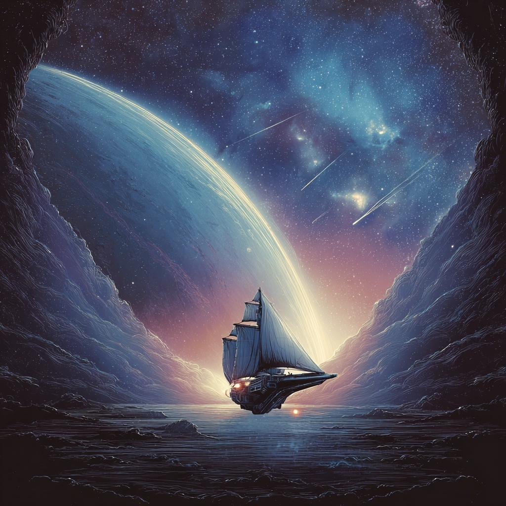 Genre: Epic cinematic orchestral fused with science fiction elements, It opens with a thunderous orchestral explosion — full brass, rapid strings, pounding piano octaves, and timpani rolls — then transitions into a symphonic voyage supported by hybrid synth textures, Style: Instrumental and narrative-driven, marked by intense contrast, sweeping dynamics, and thematic motifs that guide emotional and spatial progression, Mood: Galactic, high-stakes, and full of wonder, Begins with overwhelming sonic force, dips into tension, and climbs toward heroic grandeur, Instrumentation: Full symphonic ensemble (brass, strings, piano, woodwinds, percussion) joined by analog synths, bass pulses, and cinematic effects, Central motif (C - D - E♭ - G - A♭) anchors the thematic identity and is reinterpreted throughout, Mastering: Huge stereo spread, cinematic dynamics, tight orchestral layering, immersive spatial placement, and a clean orchestral-synth blend, studio quality, high-fidelity, best quality