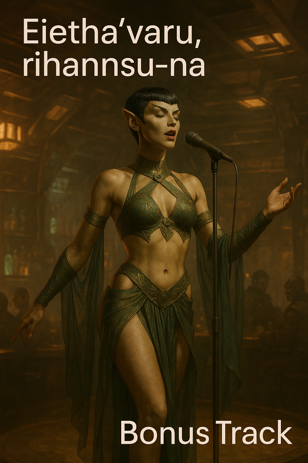 Genre: melancholic Space-Rock with Romulan undertones, emotional and atmospheric, Style: starts soft and intimate, reflective, with hints of ancient Romulan memory; gradually builds into powerful rock with determination and rising hope, Vibe: wistful, cinematic, mysterious; sorrow transforming into strength, Voice: female Romulan, whispery and airy at first, growing stronger, resonant, emotionally charged, Instrumentation: clean electric guitars with delay evolving into warm overdrive, smooth bass, soft toms expanding into full rock kit, ethereal pads with exotic Romulan textures, light strings, subtle otherworldly percussion, Atmosphere: spacious, reflective, echoing like memories through starlight, shifting into bold, uplifting rock, Dynamics: slow, hushed intro, layering progressively, reaching strong emotionally elevated choruses, ending gently with melancholic resonance, Emotion arc: grief → reflection → rising hope → empowered release → quiet resolution