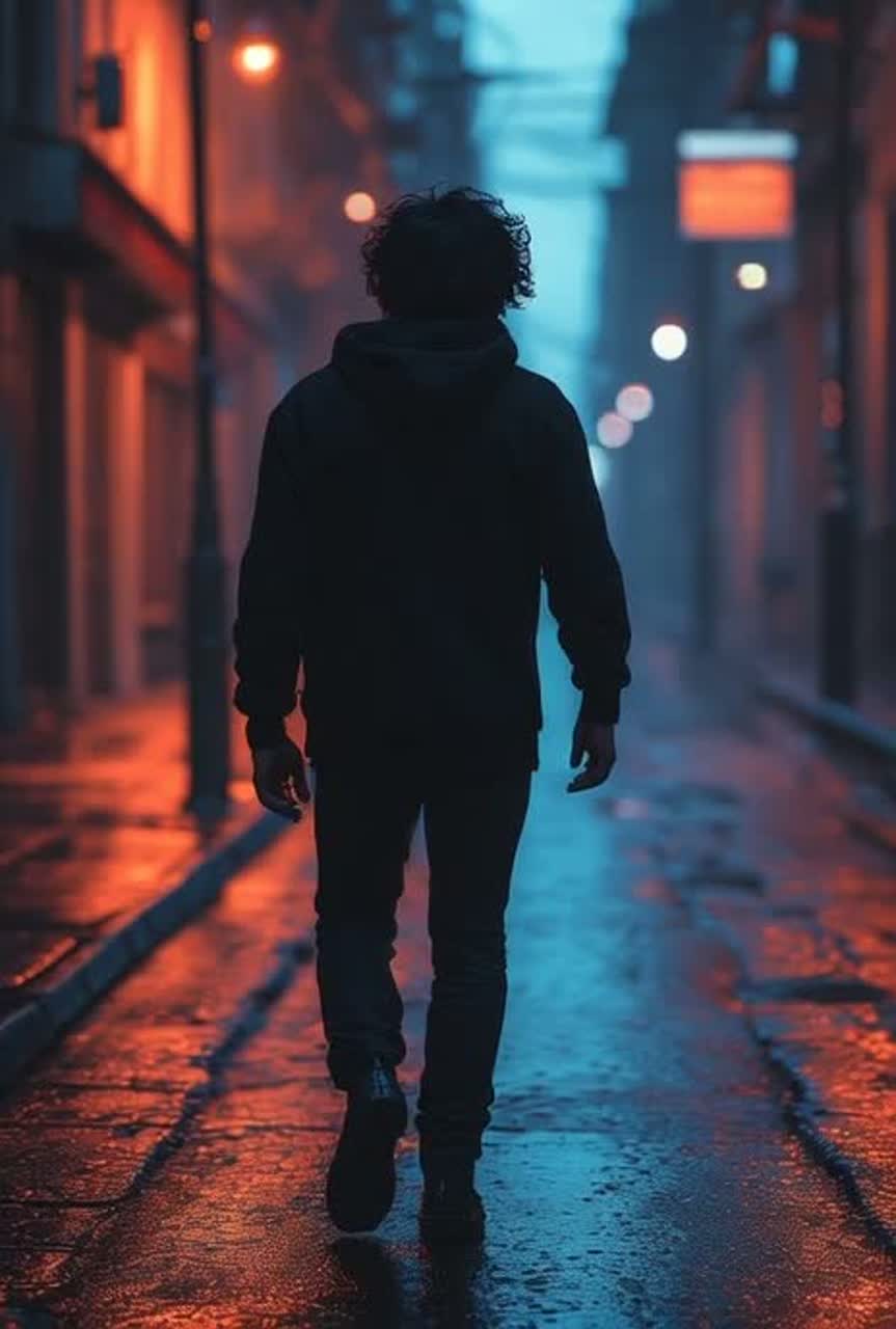 [Rock-style, dark-mystical cover: lone figure on a street at night, clear silhouette, strong shadows, high contrast, Emotional, slightly mystical, urban, dramatic atmosphere, No shiny effects, Focus on mood and tension, rock aesthetics, Tüffeli-style: playful, mischievous, dark, mystical]