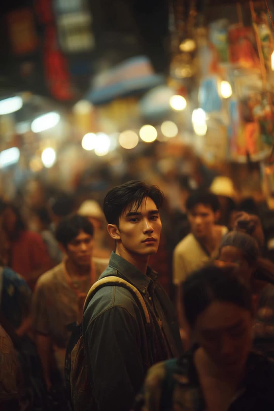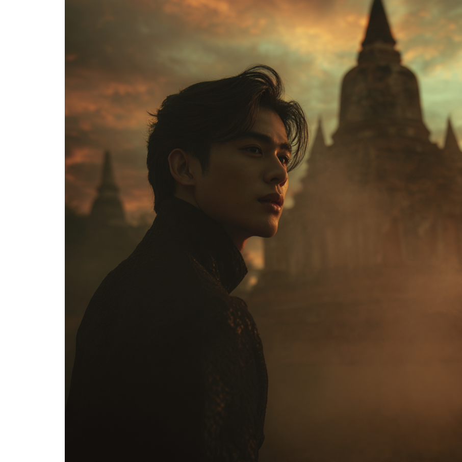 Modern Dark Thai alt-pop, minor key, 94 BPM, Acoustic guitar and ranat xylophone, pi nai oboe, and deep klong percussion layered with low strings and ambient synth pads, Gongs accent transitions, Smooth mid-tempo with subtle syncopation, Minor key progression, with a hopeful lift in the chorus, Mood: Mysterious, Romantic, hopeful, Singer’s Voice: Male, Youthful, sweet, and gentle with modern pop runs, soft falsetto touches, and close harmonies, Intimate phrasing, Mastering: Clear and polished, with wide stereo depth, warm lows, and shimmering highs, ‑ballad, ‑country