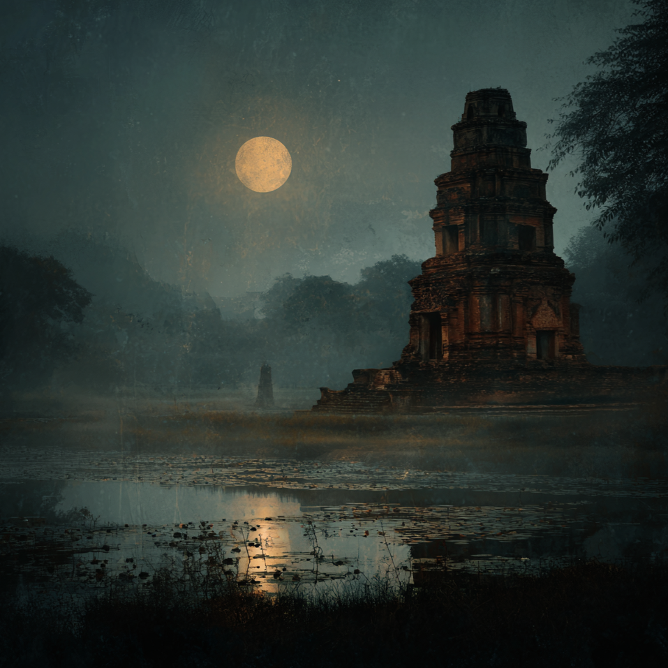 Genre: Dark vampire Thai fusion, 88 BPM, Style, habanera rhythm: Haunting build with ranat xylophone, pi nai oboe, and deep klong percussion layered with low strings and ambient synth pads, Gongs accent transitions, leading to a 16-bar interlude for looping, Mood: vampires, dark and Mysterious, romantic, Instrumentation: Ranat, pi nai, gongs, klong drums, strings, synth pads, Mastering: Wide, lush, with warm lows and shimmering highs, Singer’s Voice: Sweet and gentle, youthful tone with modern R&B‑style runs and soft harmonies, Light delivery, no belting, airy and intimate