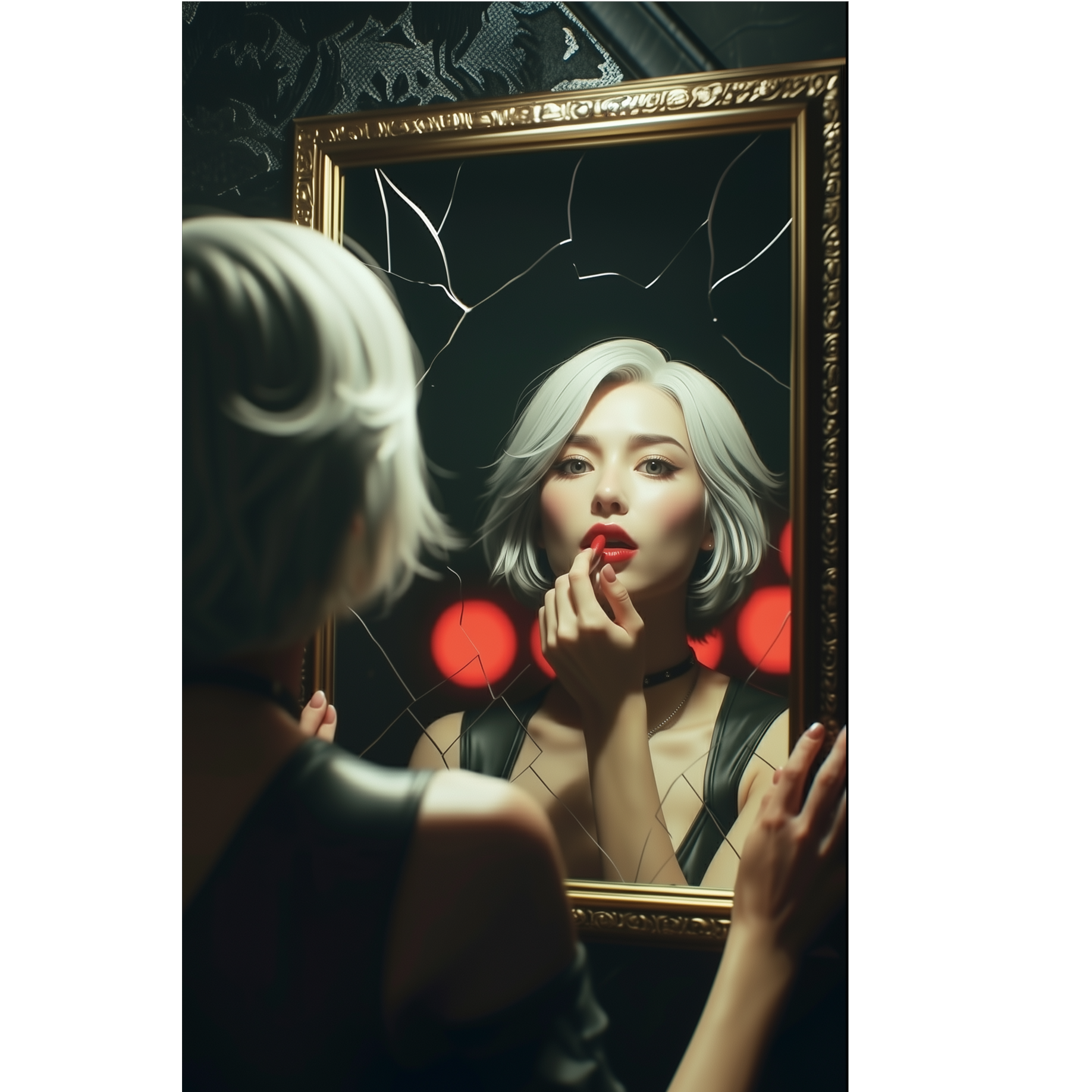 The song features glitch and digital noise rock, Female vocals, Deep, rich bass, Powerful, clear highs, Warm, rich midrange, Rich, resonant vocals, An aggressive, distorted singing style, Growls and screams are sparingly scattered throughout the vocals, A high-energy chill rock sound, Plain, melancholic vocals emphasize breathing, Fast-paced melodies from piano, guitar, and violin express emotional chaos, Distorted drums and synth bass heighten the tension, Spoken and screamed vocals, interwoven with glitch effects and sudden silences, create a dramatic impact, The chorus is sensual and decadent, The fast tempo and rich texture create the allure of deep red lipstick