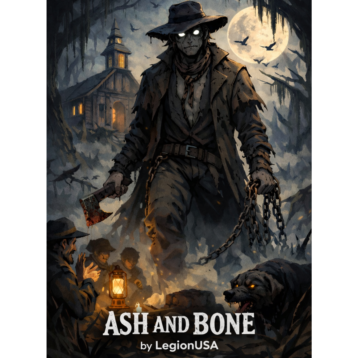 Dark Southern, Gothic, Swamp gospel, Acoustic Guitar, Foot Stomps, Chain sounds, metal hits, handclaps, crow caw sounds, low harmonica, Background humming, male voice low raspy, slow and deliberate, funeral march