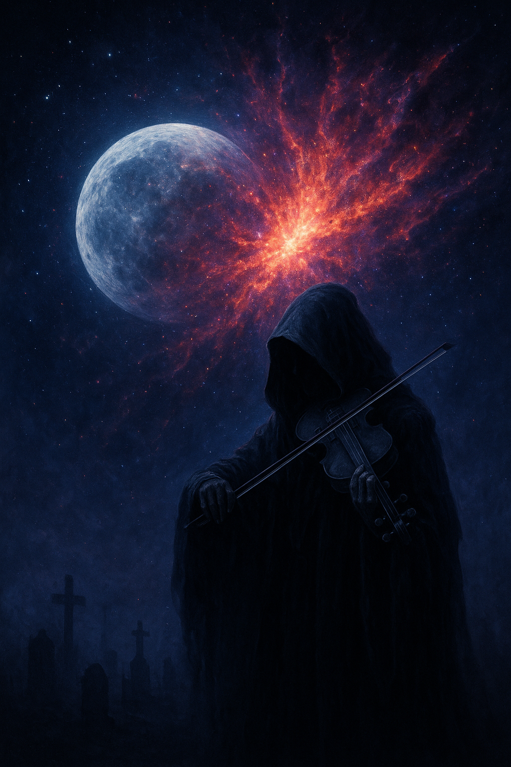 Dark atmospheric intro with deep ambient drones, electric cello, electric violin, and ascending growling bass, Slow ritual drums that evolve into massive metal drums, Heavy distorted metal guitars in Drop A# tuning, wide cinematic stereo, 808 heavy bass layered with bass guitar for colossal low-end impact, Symphonic choir pads, dark brass swells, icy reverb, and supernatural wind textures, Electric violin and electric cello duet—haunting bends, screaming high-octave runs, Darker, heavier tone: colossal distortion, deeper drones, and more aggressive crescendos, Peak section: relentless double-kick barrage, tremolo-picked guitars, apocalyptic orchestral hits, and cosmic sub-drops, Energy feels like a supernova erupting behind a dying moon, gothic, ethereal, devastating, divine, Ends with a dramatic fade into reverb-drenched strings and static dust, Instrumental with ritual spoken whispers only