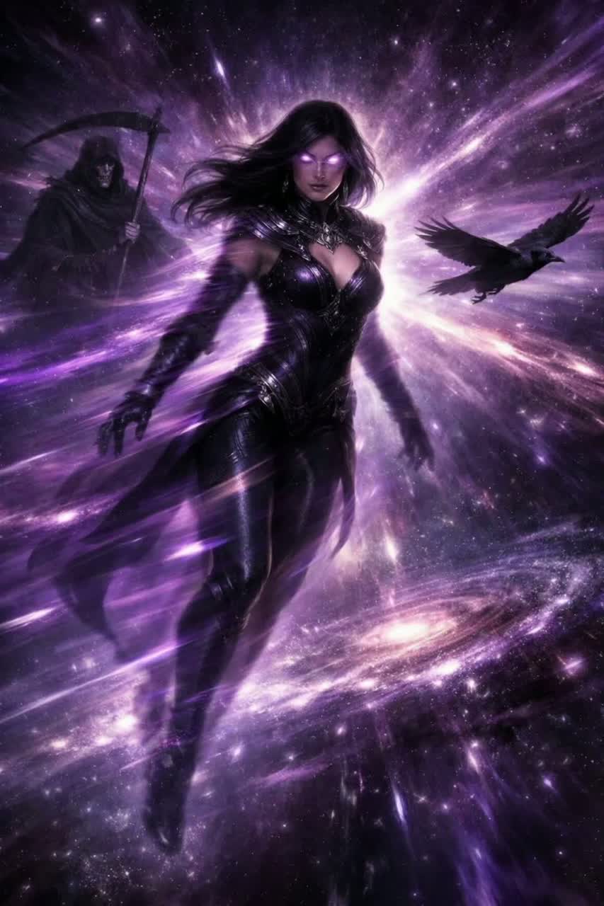 Dark Cosmic Metal • Gothic Metalcore • Atmospheric Metal • Female lead vocals only (no screaming) • Emotional, powerful, ethereal tone • Electric cello + distorted guitars (Drop A#) • Deep 808 bass • Cosmic synth ambience • Purple ultraviolet atmosphere • Cinematic impacts • Metal drums (controlled, no BRRRAT fills) • Event Horizon theme • Black hole sorrow + celestial transformation • Under 5 minutes