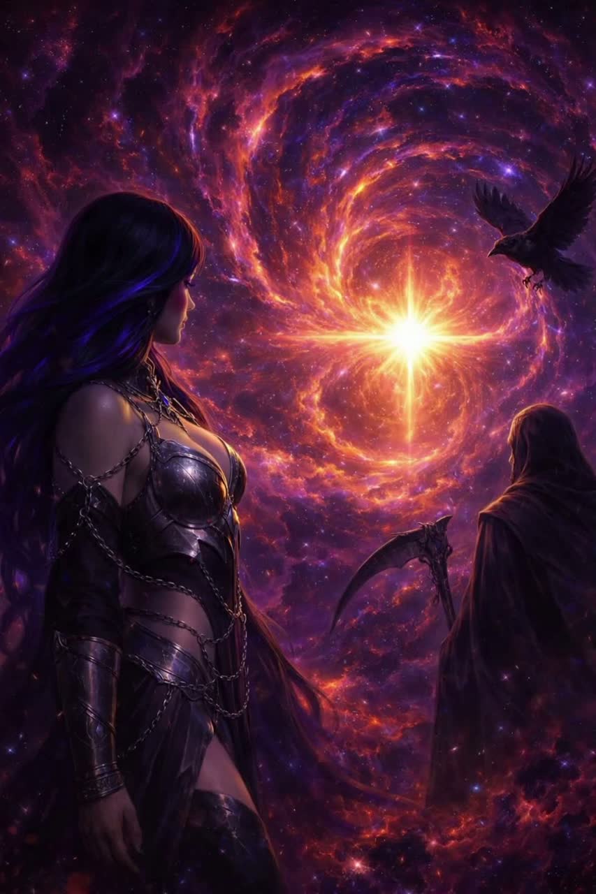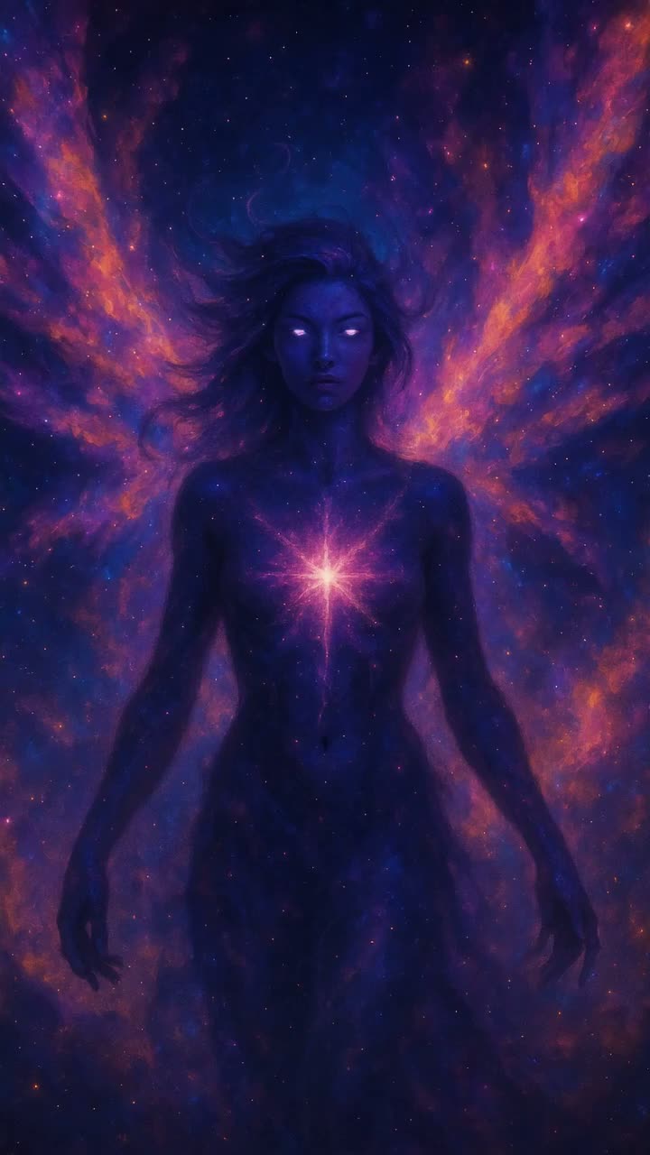 A slow, haunting cosmic intro that builds with tension and dark beauty, Female vocals only — ethereal, emotional, powerful but controlled, The soundscape begins with deep space ambience, distant gravitational rumble, and soft cosmic chimes, Add swirling atmospheric pads that pulse like slow plasma waves, Introduce a dark, celestial melody carried by electric cello and shimmering synths, Mid–tempo beat with deep reverb, soft but heavy, like footsteps in a void, Gradually add rising cosmic choirs and low-frequency resonance, Chorus opens with brighter cosmic fire elements: warm distortion, glowing pads, rising harmonics, Tone: dark, emotional, cosmic, transformative, Themes: rebirth, fractal fire, destiny, chaos becoming order, No screaming, no harsh vocals — only powerful, expressive female singing, Keep total runtime under 5 minutes