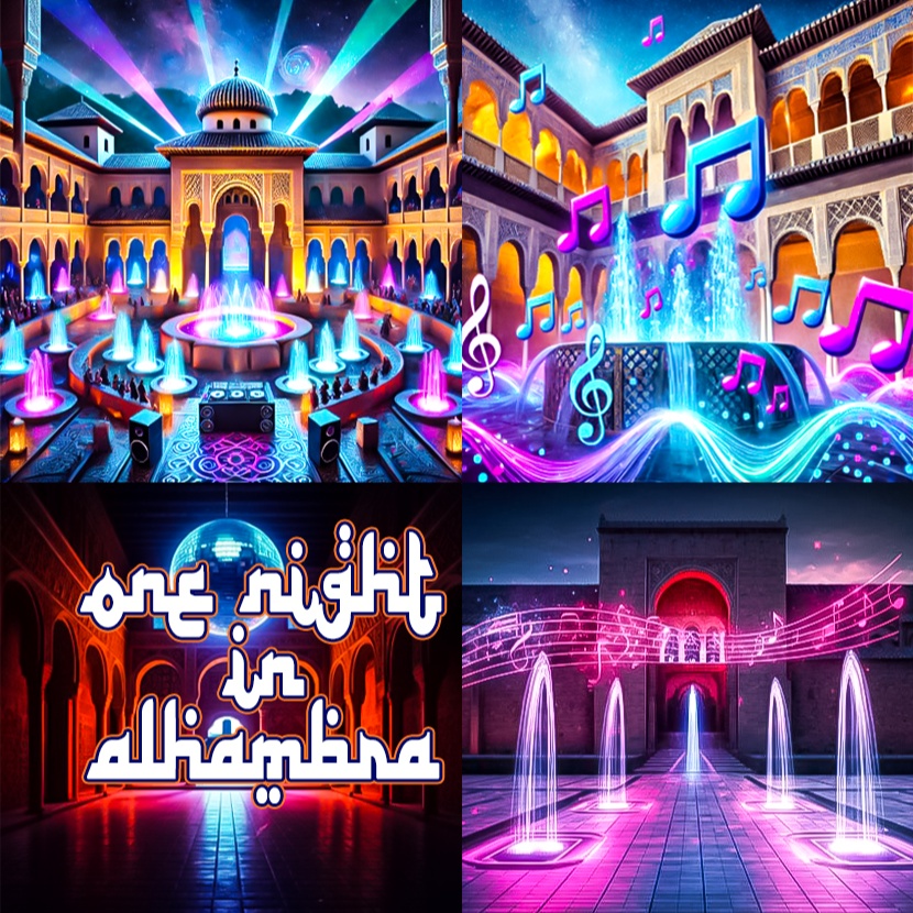 a fusion of Andalusian classical music with modern Moroccan-electronic sounds, featuring instruments like the 'ud, rabab and duff alongside driving basslines and pulsating synths, Immersive atmosphere