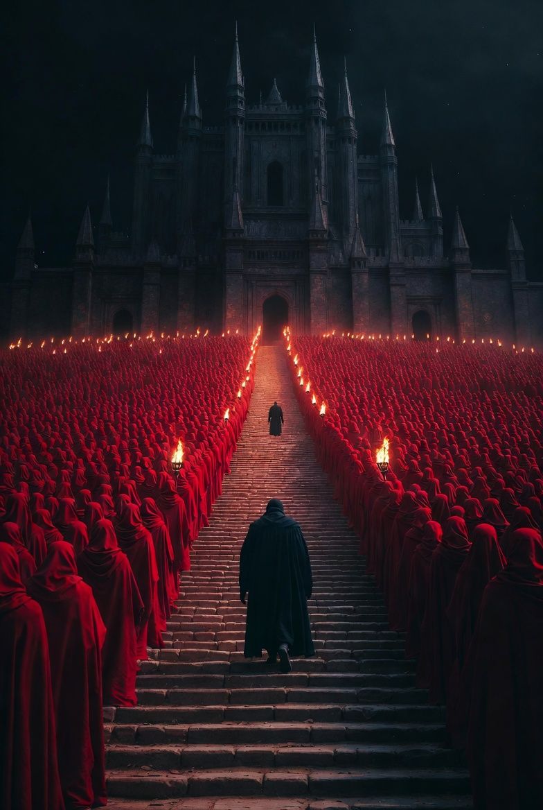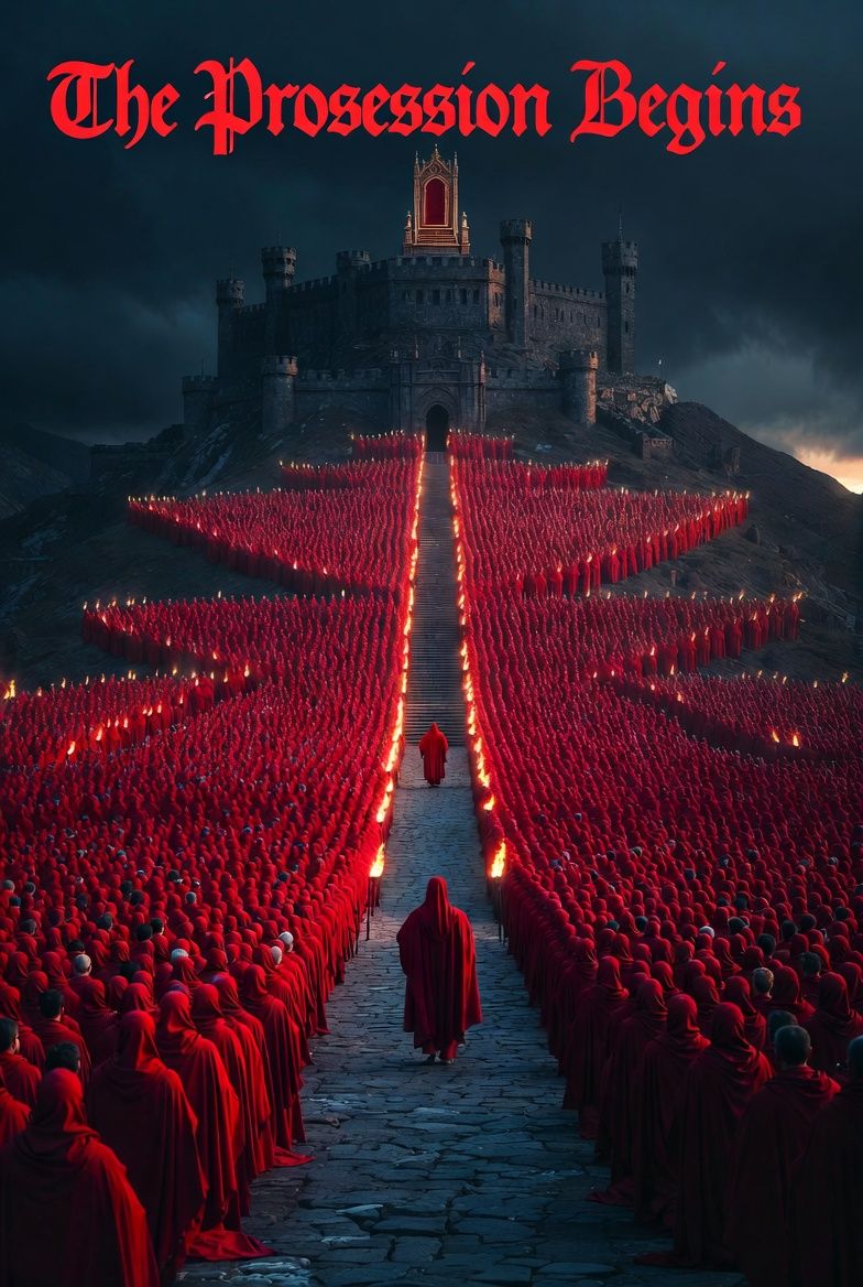 Groove metal ceremonial metalcore gothic devastation, Machine Head primary β Robb Flynn-style raspy melodic aggression blue-collar conviction melodic threat enunciating through distortion, Dimebag Darrell-style co-star Drop B through Marshall stack groove metal tone righteous devastation harmonic squeals sacred recognition arrival energy, Eminem-style rapid-fire rap verse interior monologue of ten thousand willing simultaneously, Drop B 7/8 throughout refusal to march, 48-108 BPM processional arc, B minor no resolution, Ocean Way Studios contact mic worn stone steps torch crackle recorded close, NieR-adjacent invented phonetic language bookending real English, Mastered -9 LUFS, The procession that prepared the path lit the fire and arranged itself into devotion before the crowned figure had a name to follow