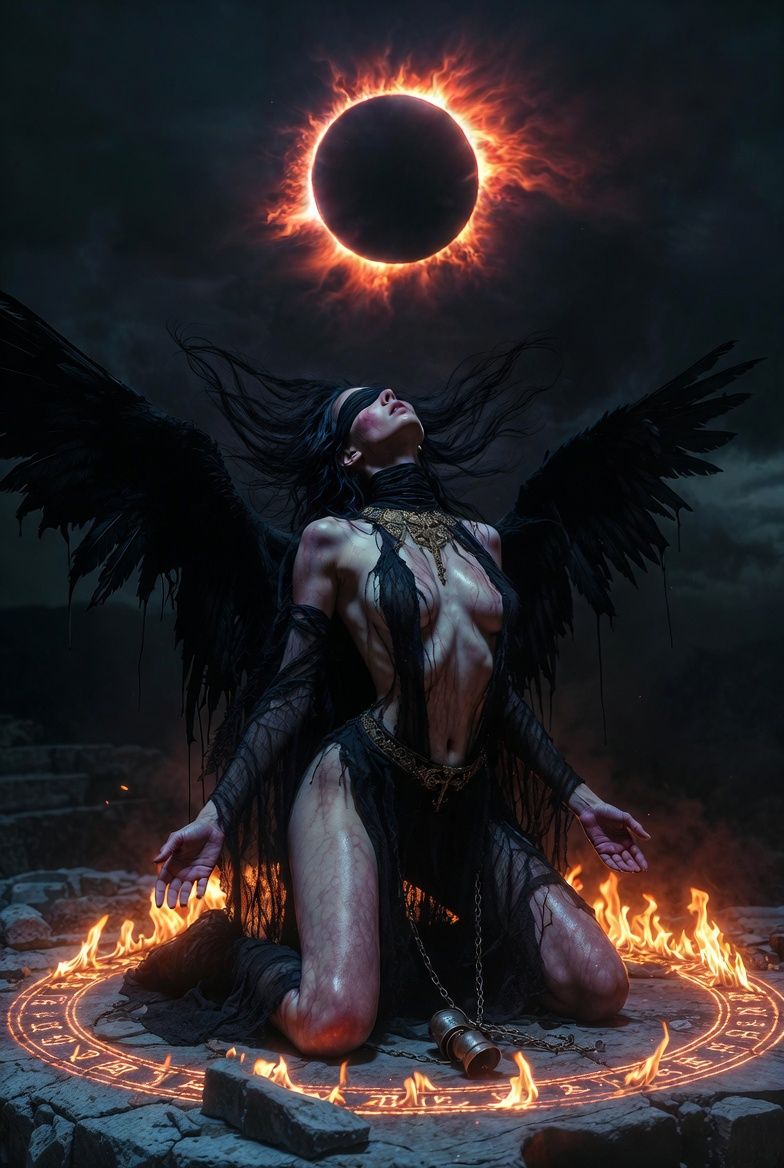 A 10-minute prog-metal odyssey delving into seductive bondage and cosmic surrender, Hypnotic 5/4 grooves pulse like chained heartbeats, layered with atmospheric eclipse drones and crushing syncopated riffs that evoke fiery encirclement, Philosophical clean vocals paint the woman's ecstatic torment, countered by two venomous guest verses of possessive confessionβmultisyllabic seduction over sludgy breakdowns, turning angelic allure into addictive ruin, The instrumental core descends into chaotic polyrhythms, mimicking the eclipse's devour, Themes explore temptation as entrapment: chains as caress, darkness as lover, under an apocalyptic sky, Ends in reversed inferno, implying eternal cycle, Alluringly dark, intricately sensual, and profoundly teasing; a flirt with the abyss that leaves you yearning for the bind, my sweet