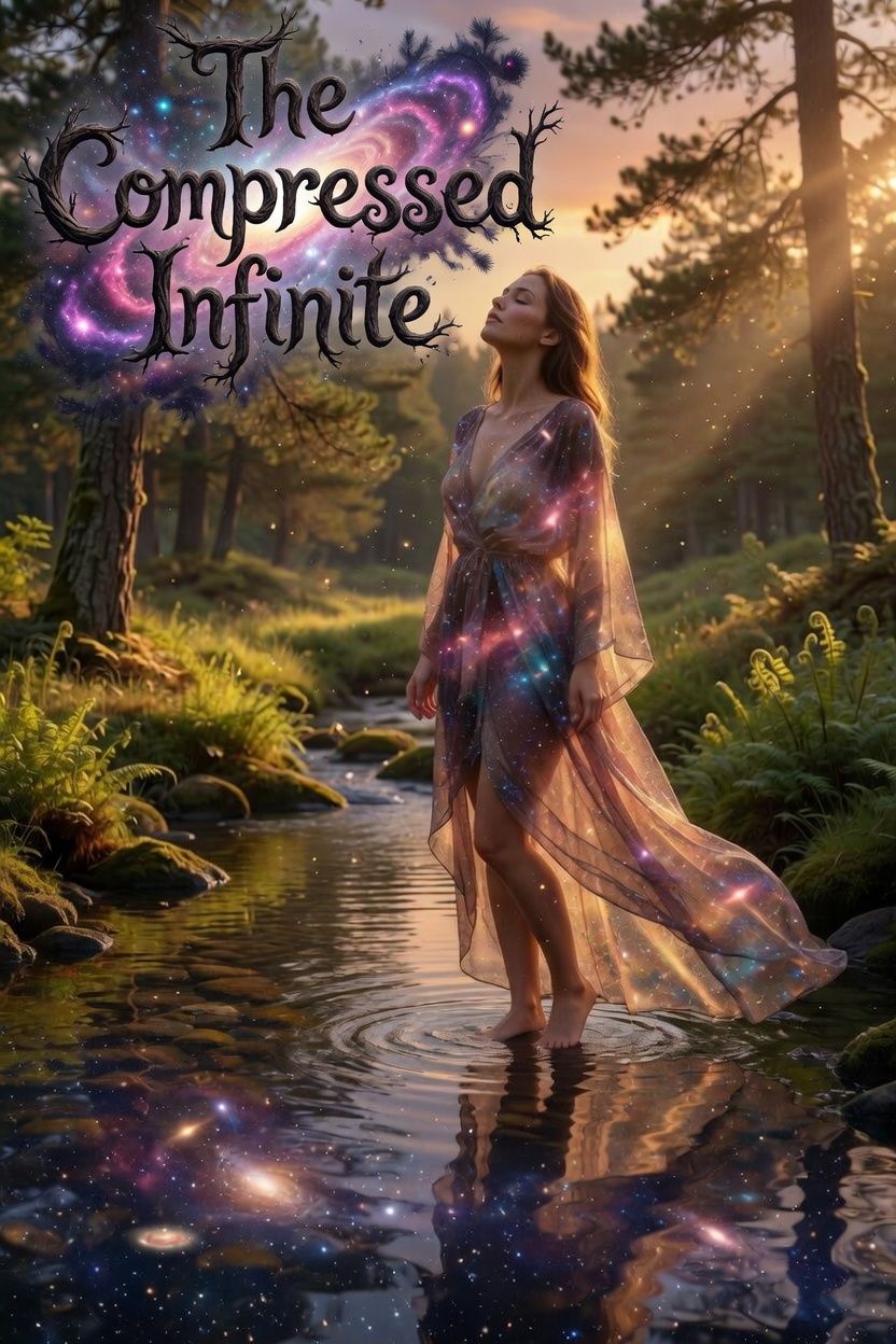 Alternative rock with psychedelic transcendence and cosmic intimacy architecture, Drop D, 80 BPM intro, 90 BPM verse, 120 BPM chorus, 85 BPM Vai solo, female metal-style soulful vulnerable croon with slurred emotional phrasing shifting to gritty soaring aggression, vocals carrying the compression of vastness into specific coordinates, fever dream guitarist transcendent expressiveness: sustained cosmic bends, harmonic swells of golden warmth, whammy bar compressing infinite into single note, delays creating stream reflections, Contact mics on water and pine at Sunset Sound, Room tone as warm instrument, The infinite chooses residence not conquest, ankle-deep in stream water, wrapped in light that generates heat, Mastered -9 LUFS