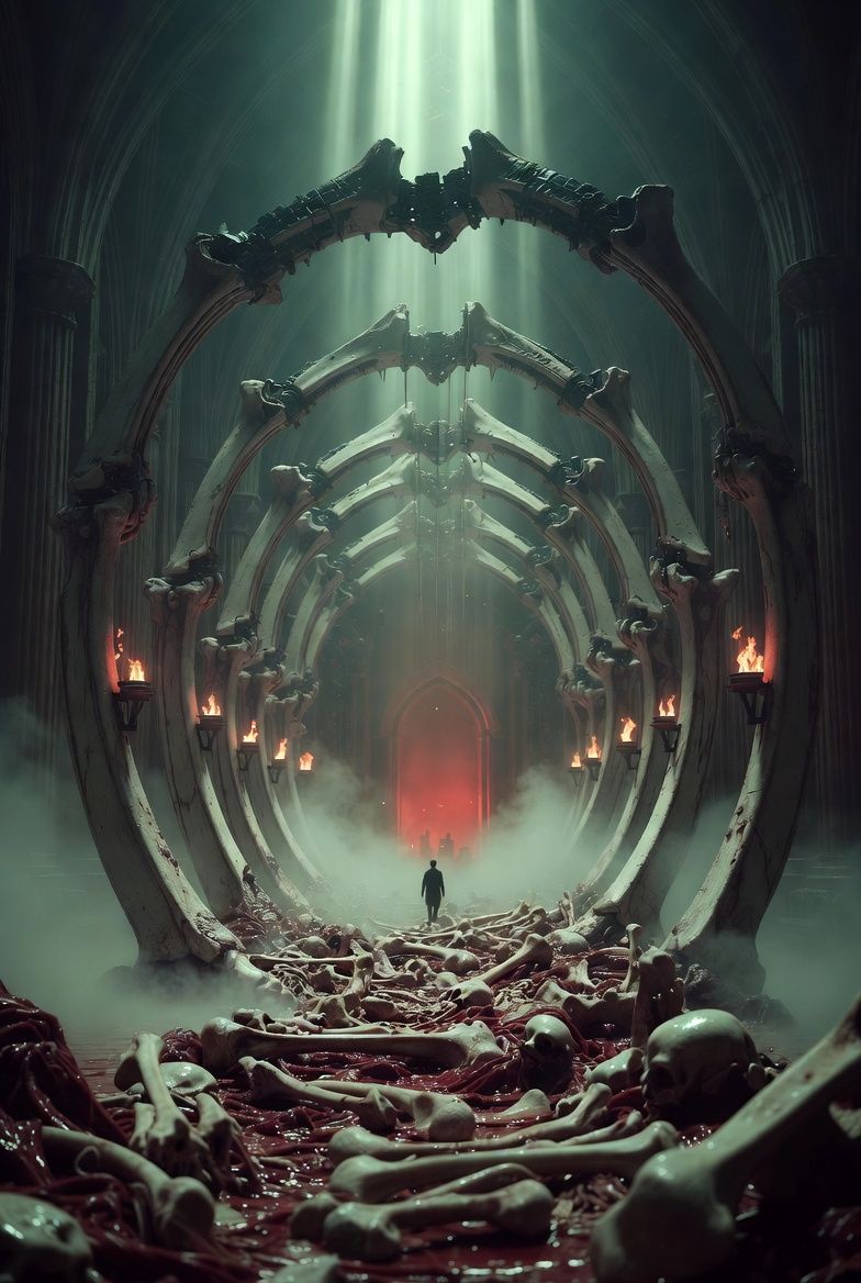 Groove metal with gothic horror theatrics and ritual digestion architecture, Drop B, 70 BPM intro, 165 BPM verse, 185 BPM chorus, 90 BPM John 5 solo, Randy Blythe ferocious raspy roars with twisted serpentine delivery, deep guttural animalistic fervor, voice carrying the witness through the devourer, John 5 horror instinct gothic theatrical, killswitch stutter as bone cracks, whammy bar dissolution in acid, ring modulator cathedral ambience, Contact mics on rib bone at Electrical Audio Chicago, We enter the belly not to be destroyed but to discover the ribcage forms a cathedral and digestion is transformation dressed as death