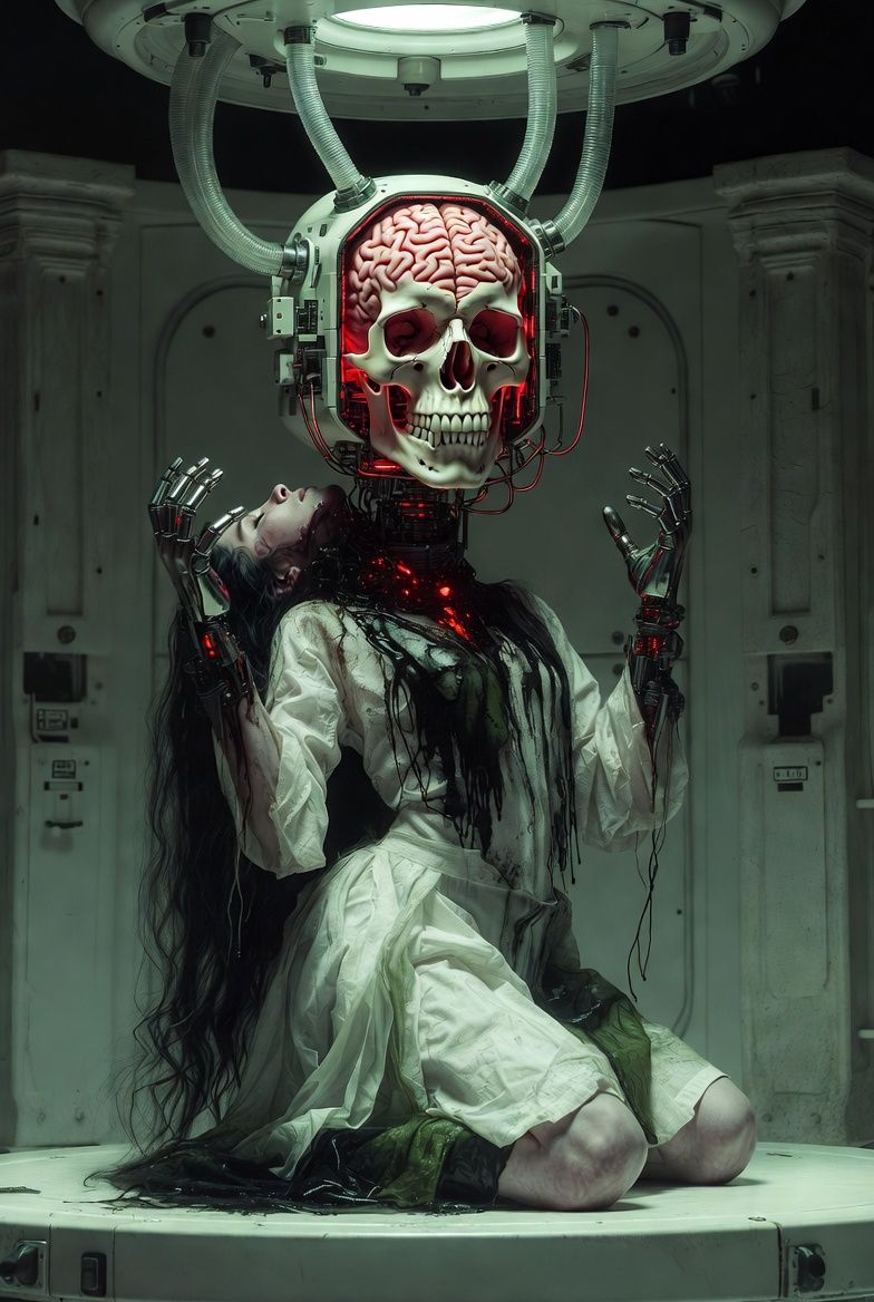Progressive artβmetal ritual from Tool feat, Buckethead-style built on devotional doom and biological horror, Drop D, 60 BPM droning intro with medical scan glitches and contactβmic stone at Electrical Audio, into 11/8 verses at 78 BPM where Female metal-style enigmatic baritone clinically narrates placing his own brain on a thorned altar, 7/8 preβchoruses tighten like seizure pulses, detonating into 4/4 choruses at 104β108 BPM, chantβstyle hooks about crowning the cortex as god, Buckethead becomes the organ itself over a 72 BPM 11/8 mantra: clean, vocalβlike bends remembering skullβwarmth, then alien legato spirals and killβswitch stabs, ending on a single high note decaying like fading thought, No majorβkey resolution, D minor holding as the altar keeps thinking without him, Mastered around -9 LUFS for heavy presence with a little breath