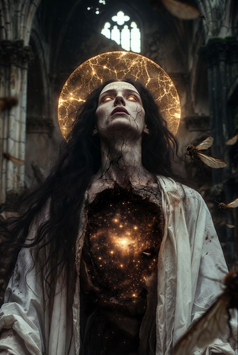 Nu-metal metalcore with ancient cracked divinity architecture and the specific stillness of something that outlasted every institution built in its name, Drop B, 44 BPM cathedral ruin intro shifting to 11/8 at 70 BPM verse, 4/4 at 98 BPM chorus, collapsing to 44 BPM Broderick passage, 7/8 at 82 BPM bridge before returning to 4/4 at 106 BPM final chorus dissolving to 44 BPM, CK Smile vocals moving between Jonathan Davis ceremonial darkness and Layne Staley beautiful devastation within the same register, the specific vocal quality of a witness who outlasted every congregation that ever stood before it, Chris Broderick neoclassical precision in B Phrygian at Electrical Audio Chicago, contact mics on cracked stone, legato runs like cracks spreading through the halo in geological slow motion, sweep picking like insects circling what still glows, at the exact frequency of something that outlasted its own name, Mastered -11 LUFS, Heaven was the light before anyone decided it needed a building