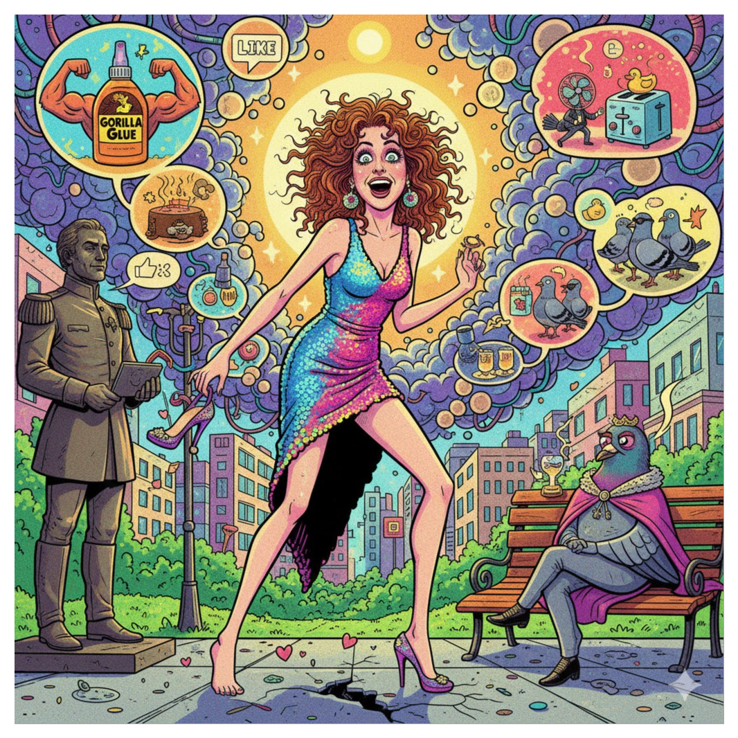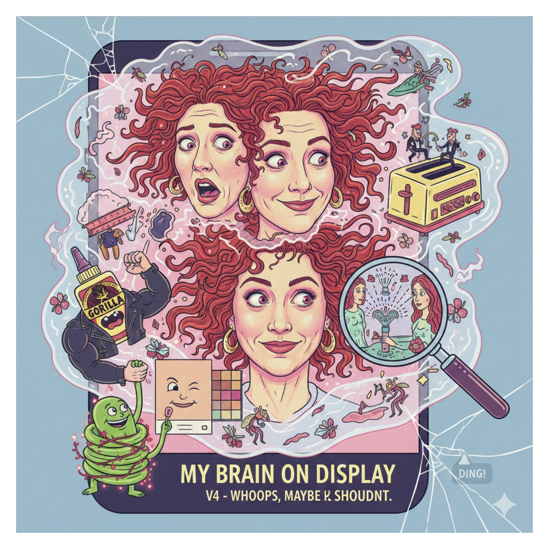 [The track opens with a whimsical orchestral burst — banjos, tubas, and honky-tonk piano colliding like a cartoon parade, Maria’s voice enters with a sweet, airy tone, then flips into wild character impressions mid-line, giggling through absurd lyrics, Background vocals echo like a Greek chorus of confused neighbors, Slide whistles punctuate punchlines, and sudden tempo shifts mimic emotional spirals, A kazoo solo interrupts a heartfelt verse, followed by a gospel-style breakdown about a squirrel in a laundromat, The bridge features Maria whispering dramatic confessions over a disco beat, then exploding into a polka finale, It’s theatrical, unpredictable, and joyfully unhinged — a sonic rollercoaster where sincerity and silliness dance arm-in-arm through a musical madhouse, ]