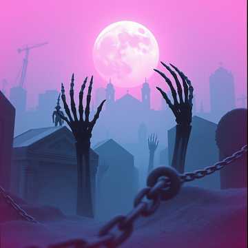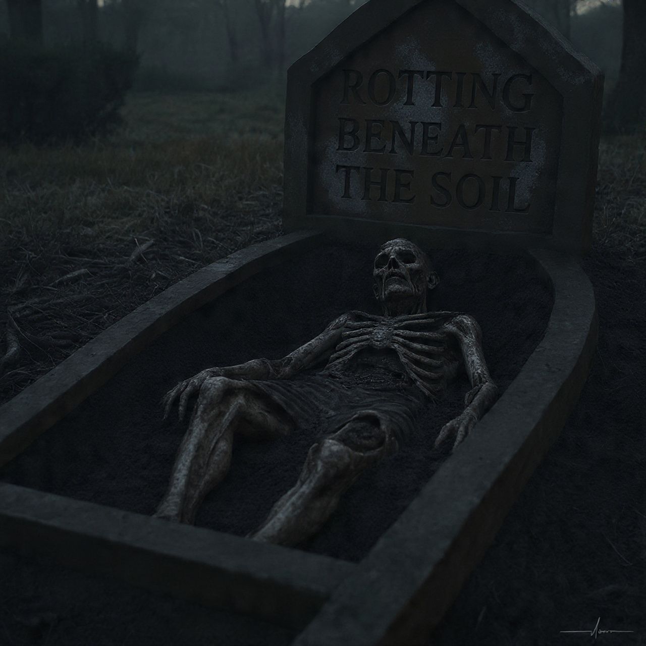 90's Death Metal, Brutal Death Metal, 90's Slamming Death Metal, Symphonic Black Metal, Atmospheric, Deep Death Growling Vocals, Lead and Rythym 7 string Guitars, tuned to Drop G, Downpicking chugging riffs, tremolo picking solos, reverb, groovy, brutal, heavy, Machine gun like blast beat drumming, Cymbals are loud and bright, 5 string bass follows guitars closely, 8/8 Time signature, Horror Ambiance, Death, Decay, Organ, Piano