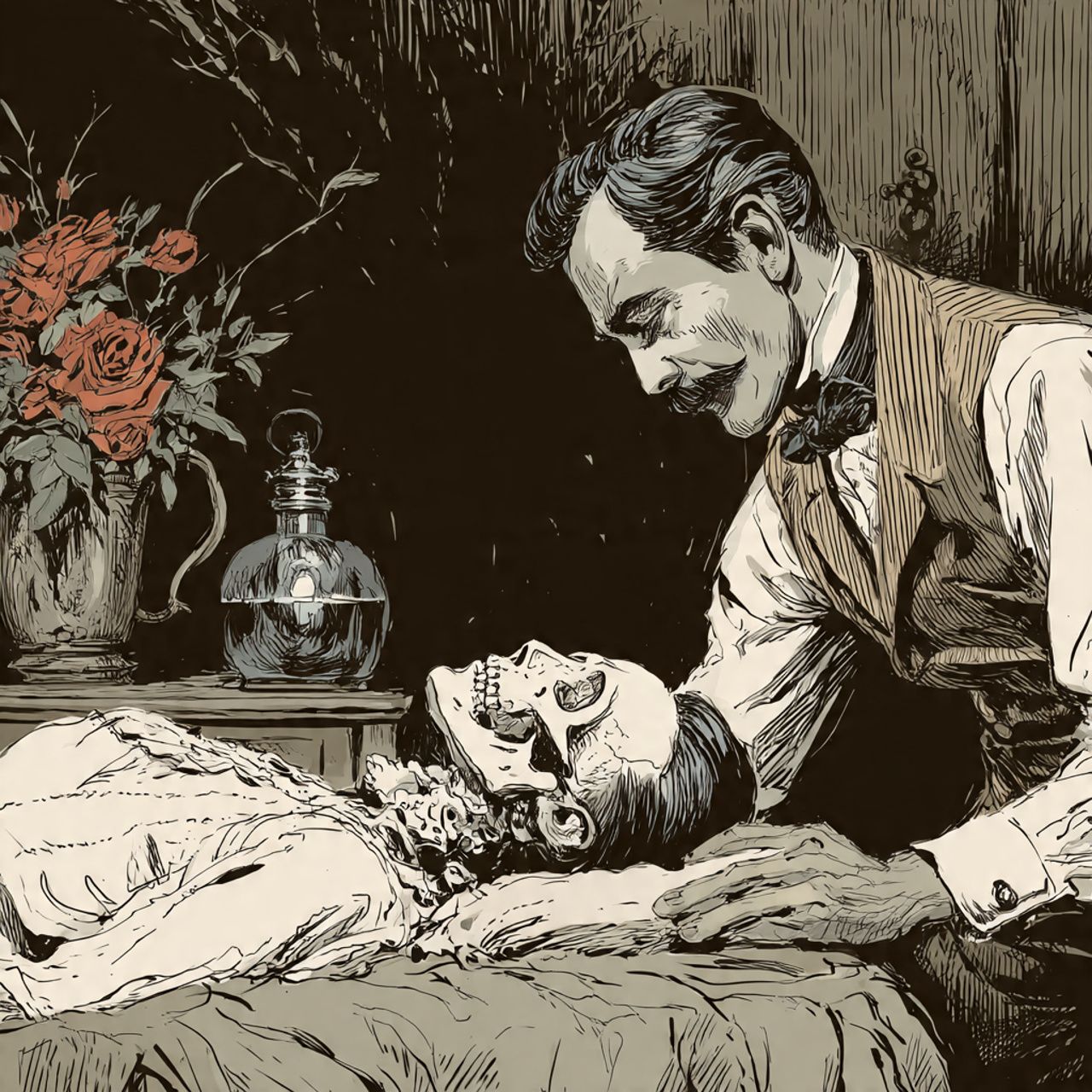 Death Metal, Symphonic Black Metal, Industrial Death Metal, Deep Death Growling Vocals, Lead and Rythym Guitars, Tuned to drop D (D-A-D-G-B-E), Alternate Picking, Phrygian Scaling, Palm Muting, Chugging riffs, 4/4 time signature, Bass follows guitars closely, Keyboards, Synths, Gothic Orchestra, Vampiric Orchestra, Gothic Ambiance, Vampiric Ambiance, Decay, Vampire, Death, Dark