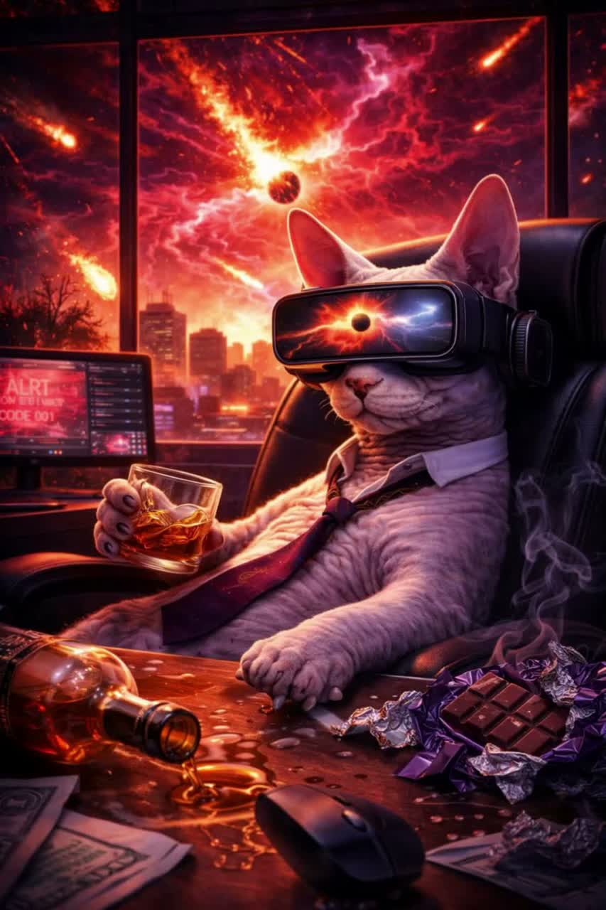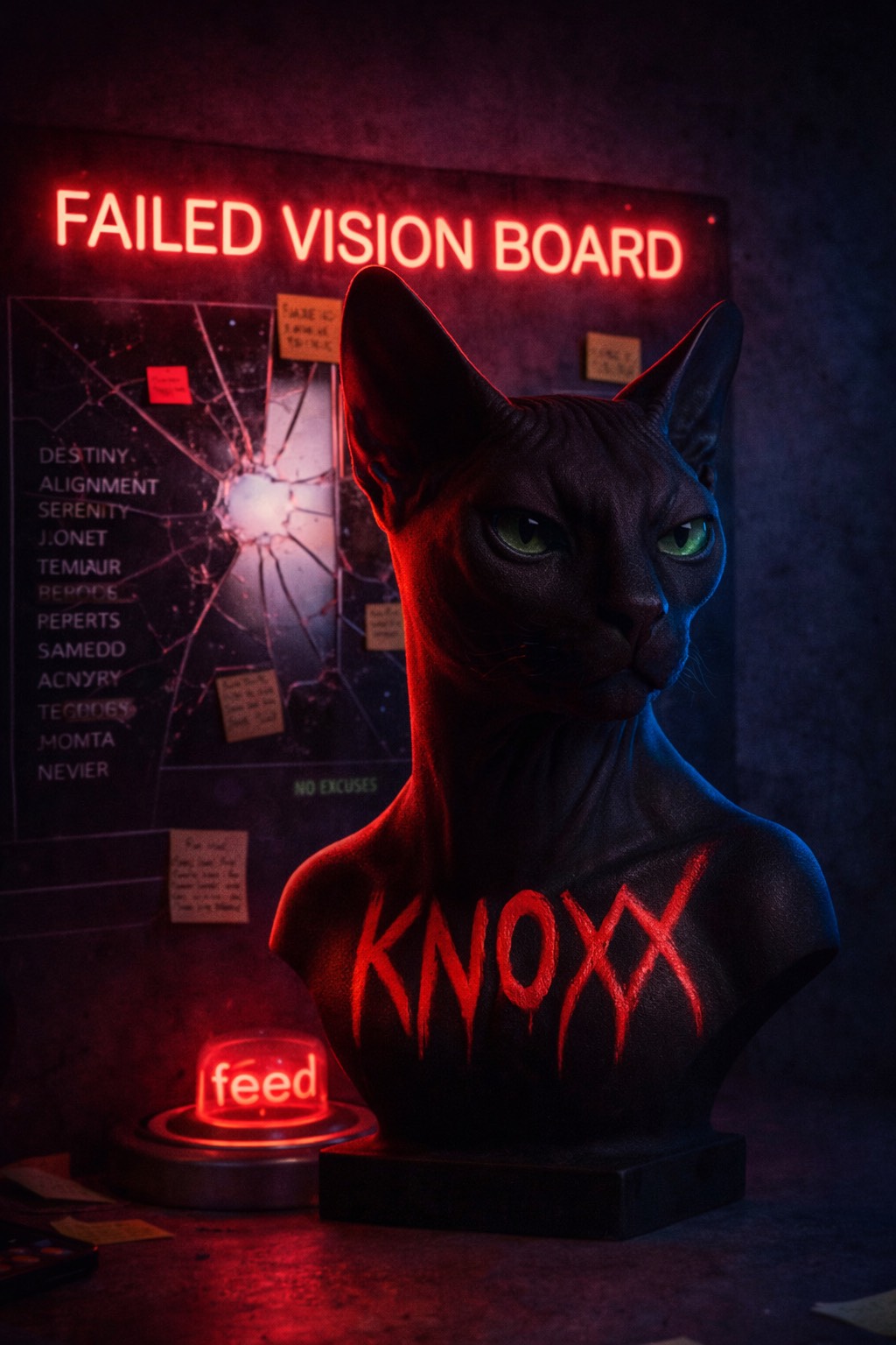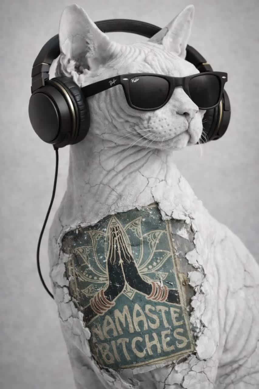 • Male vocal as the cat’s voice (deadpan, judgmental, calm, slightly robotic / telepathic)