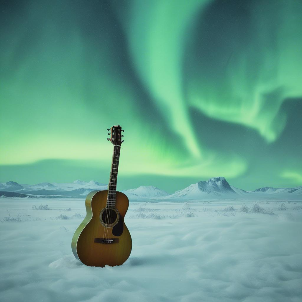 psychedelic synths blend with traditional Inuit throat singing and frame drum rhythms, haunting experimental soundscape, innovative electronic textures evoke icy landscapes and the mystery of the Northern Lights, with sparse echoing melodies