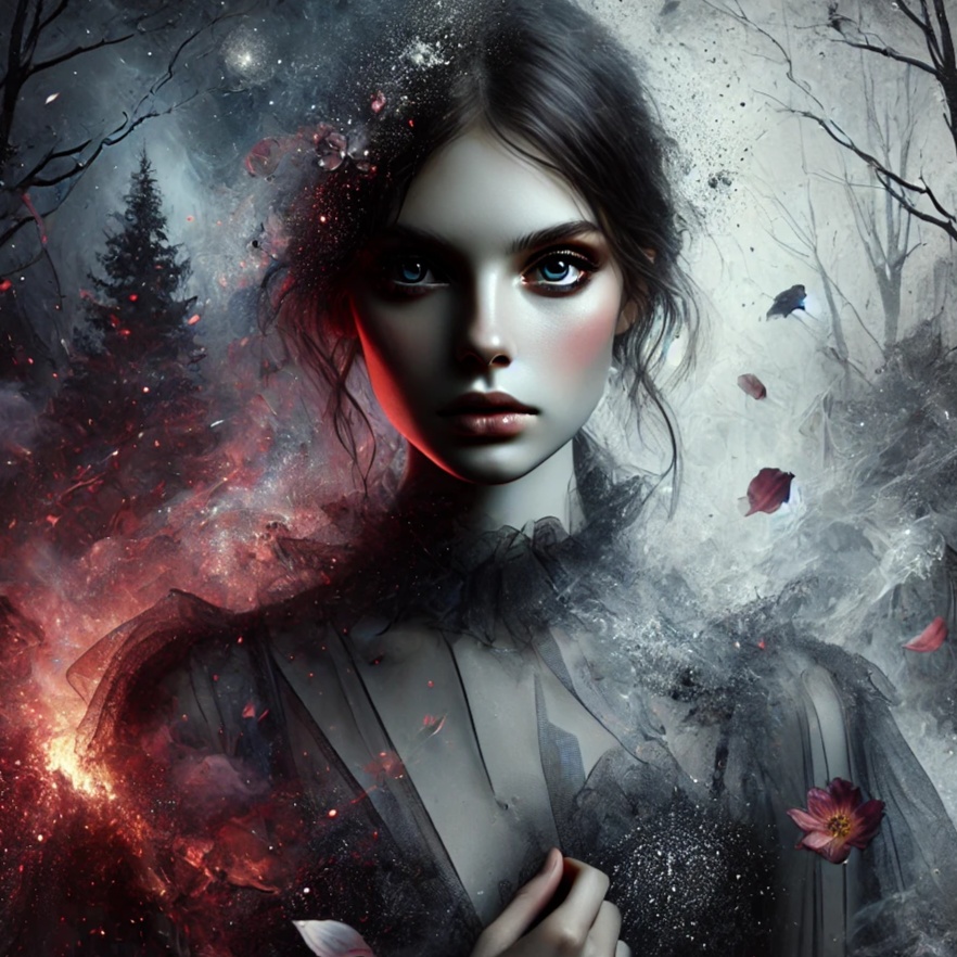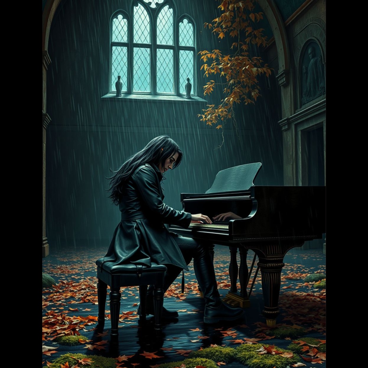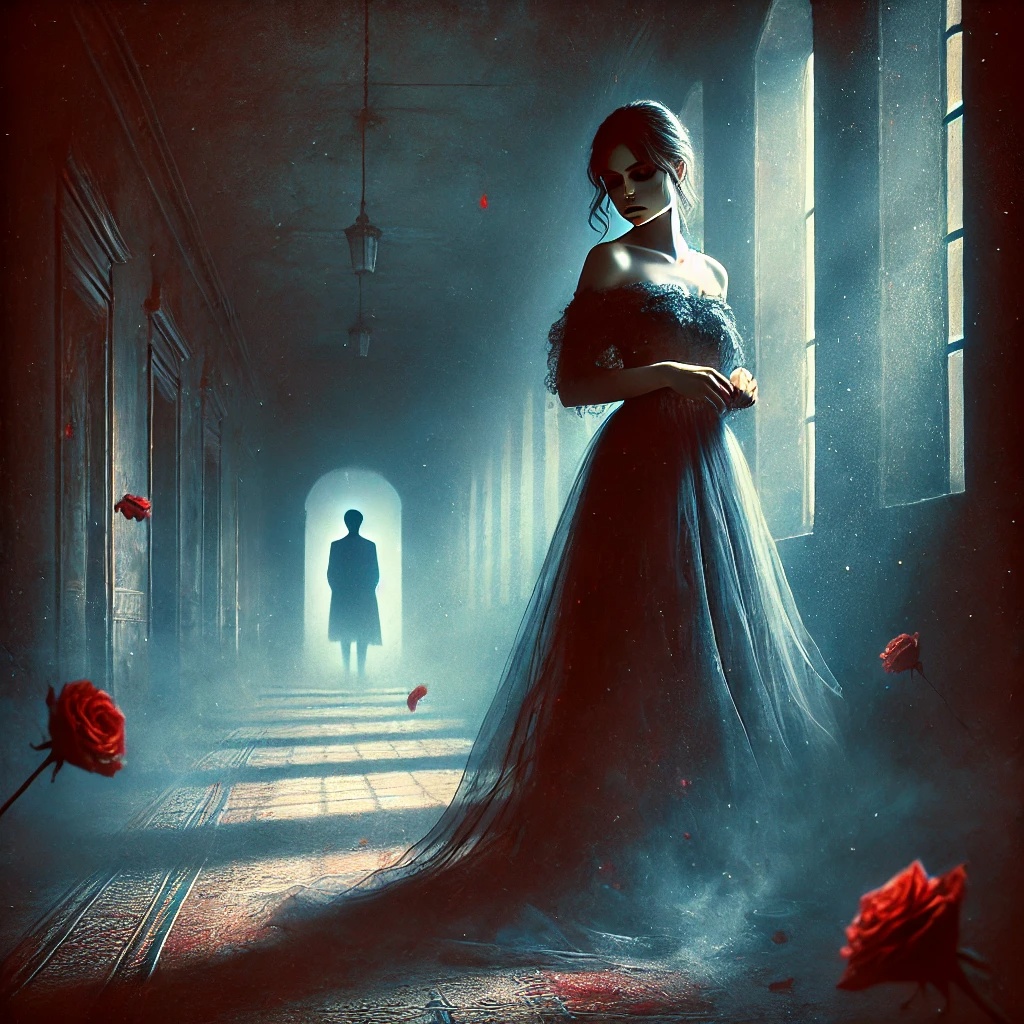 A haunting, cinematic alt-electronic ballad with melancholic pianos, eerie echoes, deep strings, soft synths, and a hypnotic, emotional female voice, dark jazz, soft hums, dark romance vibes