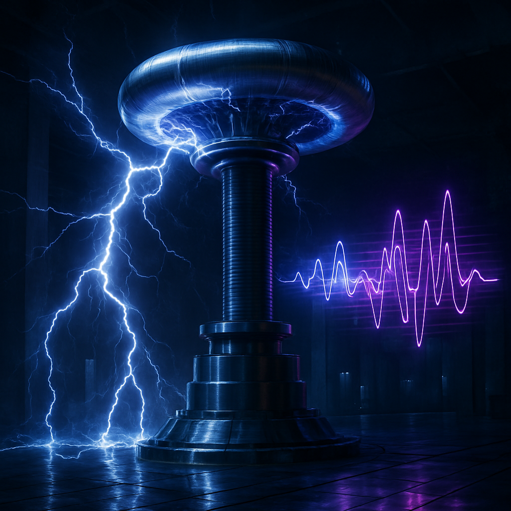 A futuristic dubstep track centered on the raw power of a Tesla coil, Begins in darkness with deep, thunderous Tesla discharges as the only sound, bass-heavy and menacing, Gradually, mechanical drum machine beats fade in, joined by crisp hi-hats, Heavy wobble bass lines rise from the depths, layered with a low, resonant 808 that hums intermittently, Elegant darksynth melodies begin to swirl above the bass, like electrical arcs dancing in the night, Vocals enter with a short, repeating rhyme about the Tesla coilโs function, chanted with precision: โCurrent flows, the field ignites / Sparks awake in neon nights, โ The drop hits as the coilโs crackle locks perfectly to the bass rhythm, creating a fusion of mechanical force and melodic elegance
