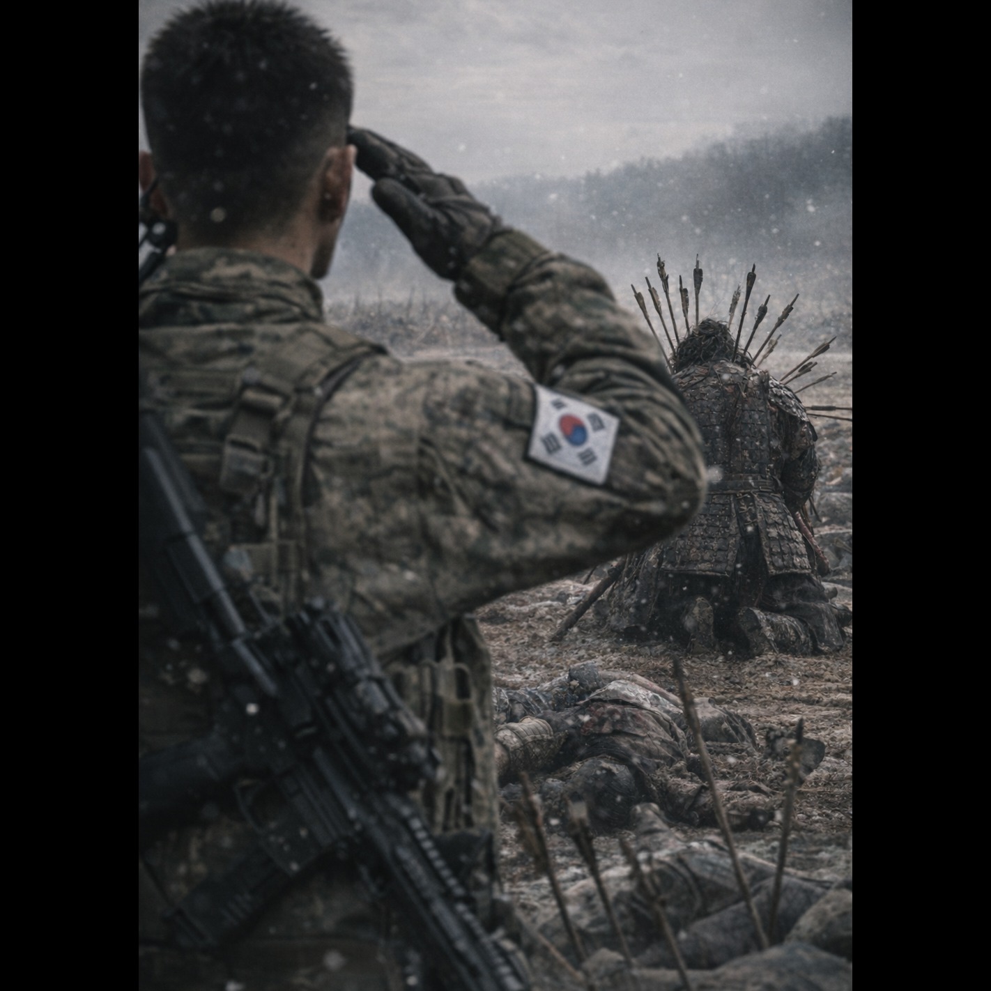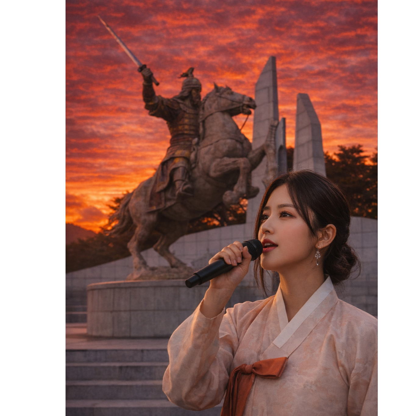Epic melodic metal with restrained intensity, Lead male vocal JSTONE: calm, grounded, no heroic exaggeration, soldierโs testimony tone, Mid-tempo (90โ100 BPM), heavy but controlled riffs, clear rhythm section, no over-dramatic orchestration, Theme: Hwang Jinโs campaign from Ungchi/Ichi blocking battle to Jinju Fortress, focus on duty, not glory, Female trio support vocals: YEONI for piercing but controlled high chorus (no reverb wash, forward vocal), SEHI for soft reflective bridge with distance and restraint, JIHEE for one short low, weighty line before final chorus (compressed, chest-centered tone), No emotional explosion, no shouting, Atmosphere: responsibility, memory, quiet resolve, Ending feels like a statement, not mourning