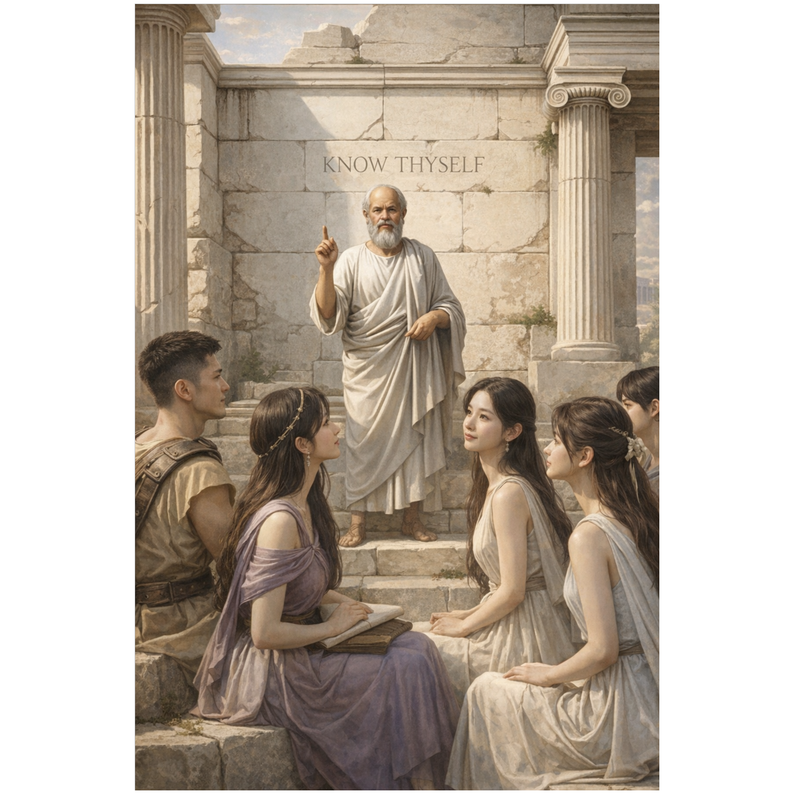 Korean protest metal ballad, slowโmid tempo 4/4, dark restrained intensity, Female vocal YEONHEE style: high notes cutting through distorted guitars and buzzing textures, no muffled tone, controlled grit, restrained emotional delivery, no screaming, sustained high notes that endure rather than explode, slight delayed bends, open-ended phrasing, Vocal front and dry, minimal reverb, Instrumentation: low-tuned electric guitars, steady heavy drums, subtle strings in chorus, no choir, Mood: speaking uncomfortable truth, civic conscience, quiet defiance, Not heroic, not tragic spectacleโcalm, sharp, and unyielding, Theme: Socrates as a citizen who asked questions until words became a crime, Emotion is contained pressure, not cathartic release