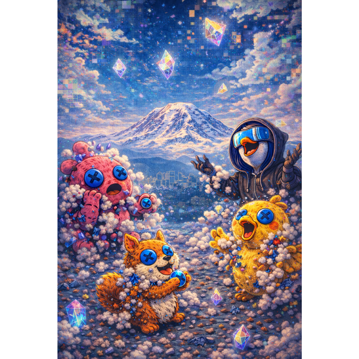 [genre: plushy cyberpunk, bashkirian glitch-folk, skunk funk, indie-electronic] [style: j37 tape saturation, toy-box bit-crushing, quray-inspired synth-flute, ethereal drones] [groove: unquantized swagger, 25% human latency, free-rhythm modal pulse, incalzando surge] [voice: little chicken (high-pitched nasal plushie growl, vulnerable falsetto clucks, shamanic wail)] [featured: circuit-bent kalimba, taiko drums, quray-style breathy synth, frame drums] [motive: 360-degree feather-panning, vertical pitch sweeps, click-clack] [lead: detuned toy-piano (plucked, wooden, haunted, 19th-century gothic)] [bass: plush-fuzz bass (heavy, squelchy, sub-pressure resonance)] [kit: massive taiko ensemble, squishy percussion, industrial clock-clicks] [acoustics: binaural 3d spatial audio, wide holographic soundstage, phase-aligned] [production: -3db headroom, no brickwall limiting, transparent dynamic range, deep low-end punch] [mastering: studio master, 24-bit fidelity, 48khz, analog tape glue]