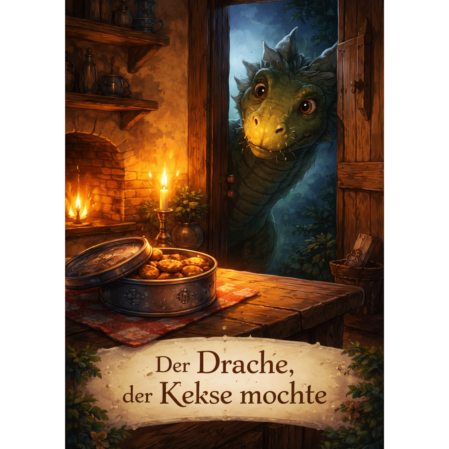 German spoken-word fairy tale narration (NOT sung), Cozy whimsical cinematic underscore, 84 BPM, G minor, Lead: old male storyteller, warm, gravelly, soft spoken, clear diction, playful timing, Music bed: music box motif, soft acoustic guitar, upright bass, brushed drums, gentle strings, fireplace crackle + subtle foley, Keep narration dominant, music supportive; natural pauses and small chuckles, Use section tags in lyrics; dynamic swells only between phrases, Mix: close-mic voice upfront, light plate reverb, warm EQ, wide soft background