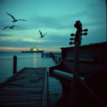 A dark cabaret, cinematic chanson, and acoustic folk piece in D or E minor, Melancholic piano opens amid faint seagulls and ship horns; fingerpicked classical guitar and pizzicato bass join, Verses are sparse, with baritone vocal center stage, Choruses swell: bowed bass, brushed snare or tambourine, distant accordion, and haunting ethereal soprano harmonies, Bridge brings solo cello, emotional and reverb-laden, Outro weaves cello, airy soprano, and ambient noise, gently fading, Wide stereo spread, clear mid vocal, lush textures, careful frequency separation throughout
