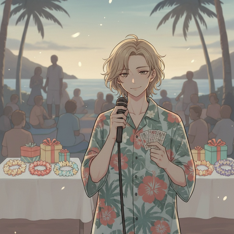 Live outdoor beach performance recording with audible ocean ambience and cheering crowd, Bright tropical festival atmosphere under soft glowing stage lights, Call-and-response sections with crowd chants and hype shouts, Quirky funk groove driven by slap bass and syncopated rhythm guitar, 90s hip hop influence blended with tropical percussion (congas, shakers, light steel drum accents), Subtle lofi texture layered beneath the arrangement—gentle vinyl noise, filtered air, and warm tape softness, Minimal ambient pads and soft reverb tails that bloom briefly between phrases, Minimalistic verses with rhythmic vocal focus and comedic timing, High-energy chorus that opens up spatially while maintaining groove clarity, Dramatic tempo and arrangement changes for comedic effect, Breakdown section with slowed groove, washed ambience, and momentary suspension, Stuttered vocal effects and rhythmic dropouts in the outro, Overall mood: chaotic fun, ironic tragedy, festival joy, and radiant light