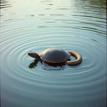 Create a 95 BPM sacred Thai–Chinese fusion with Guqin, Thai flute, Khim, soft drums, and temple bells, Mood: balanced, serene but energetic, Represent the meeting of the Turtle and the Serpent—Earth and Water becoming Wind, Let rhythm pulse gently, symbolizing unity of motion and stillness, Include subtle chanting “Ning nai khluean, khluean nai ning” (นิ่งในคลื่น เคลื่อนไหวในความนิ่ง), End with bell echoes fading into harmony, representing equilibrium of the universe