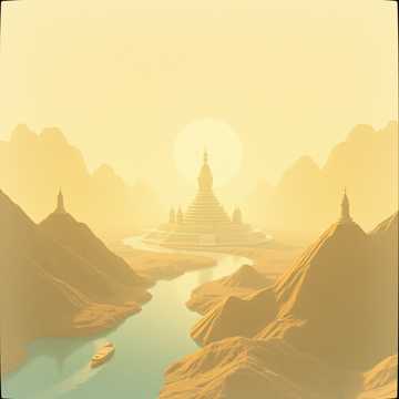 Create a medium-tempo (92 BPM) sacred Thai fusion, Instruments: Guqin, Thai flute, Khim, soft drums, and temple bells, Mood: flowing, expanding, uplifting, Symbolize faith spreading like ripples in water, Begin calm, then build rhythmic pulse at 1:00, Add flute melody rising at 2:00, Use water sound textures and soft female chanting “Na–Ka–Siam, ” End with echoing bells fading into silence, representing endless flow of light