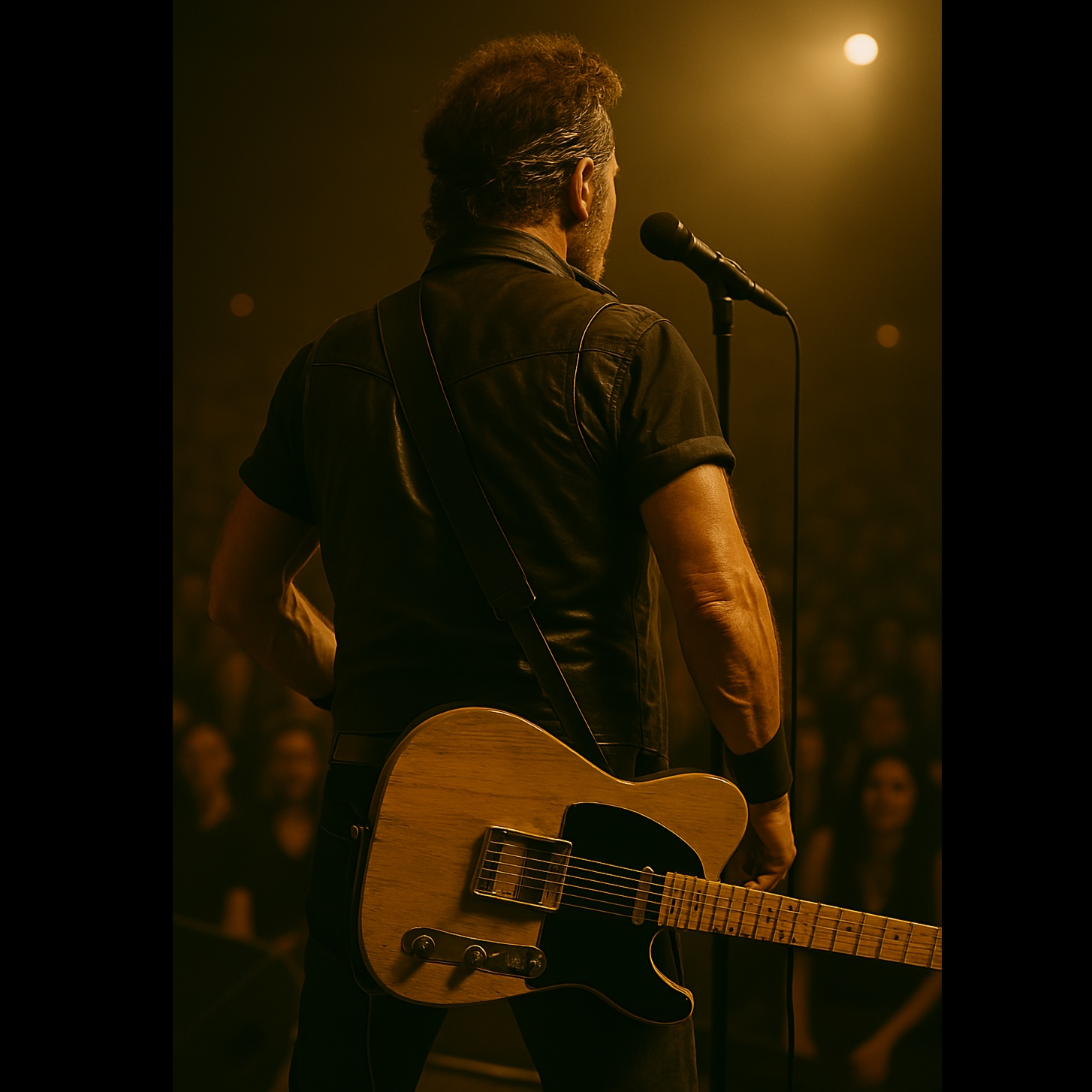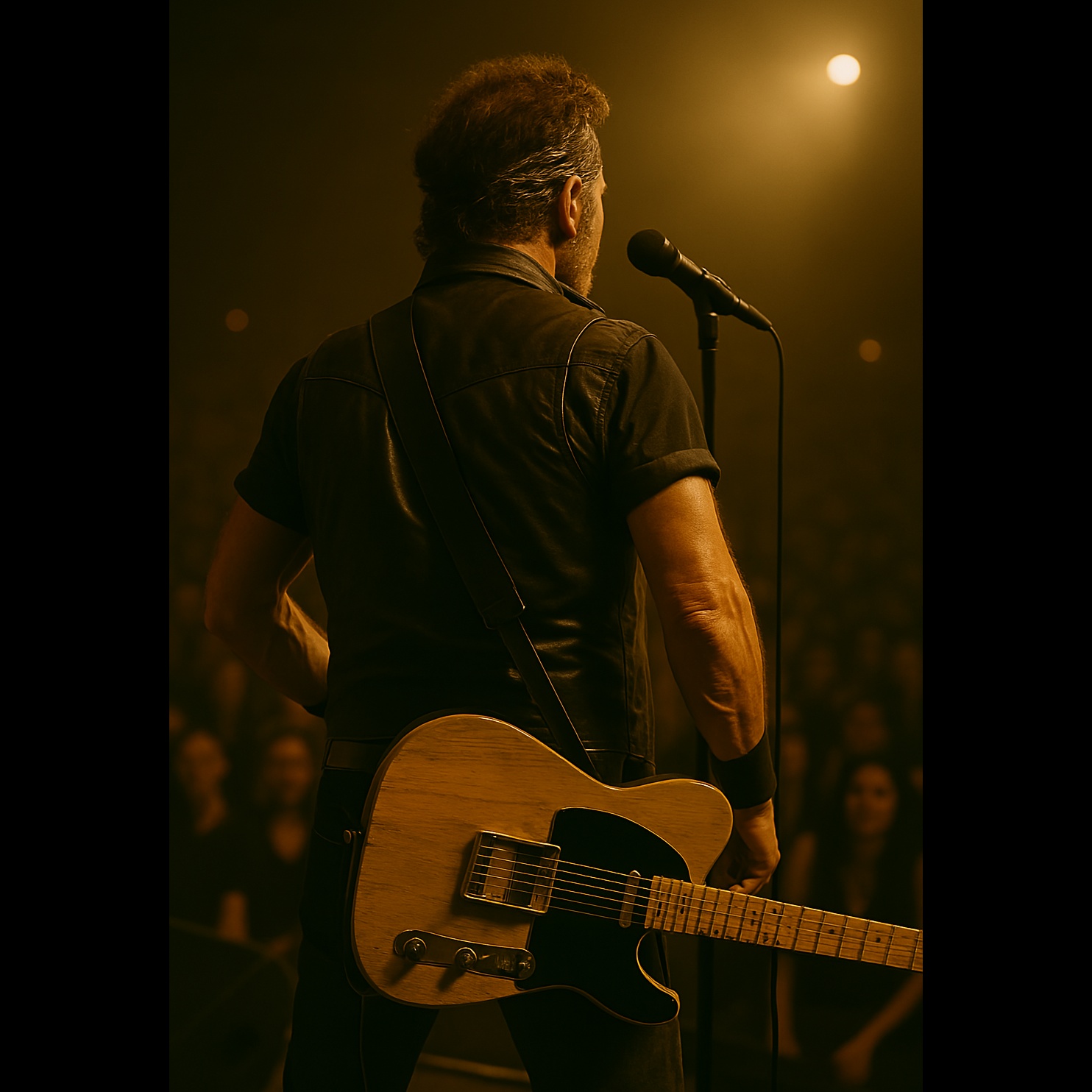 live heartland rock performance with a full band in a packed stadium, The lead vocal should be a gritty, soulful male baritone or tenor with a slightly raspy, emotional toneโpassionate, raw, and full of working-class spirit, The voice should feel lived-in, capable of both urgent power and quiet storytelling, Include rich instrumentation: twangy electric guitars, bright piano, Hammond organ, harmonica, tight drums with driving backbeat, and a warm, melodic bass, The song should have a steady groove, emotional build-ups, and a strong sense of movement, Include spoken intros or shout-outs to the crowd, extended bridges, and big, chant-worthy choruses, Add live reverb, crowd reactions, and band callouts, The mood is nostalgic, blue-collar, resilient, and hopefulโcapturing stories of everyday struggle, dreams, and personal triumph, It should feel like a heartfelt anthem played by a band thatโs lived every word