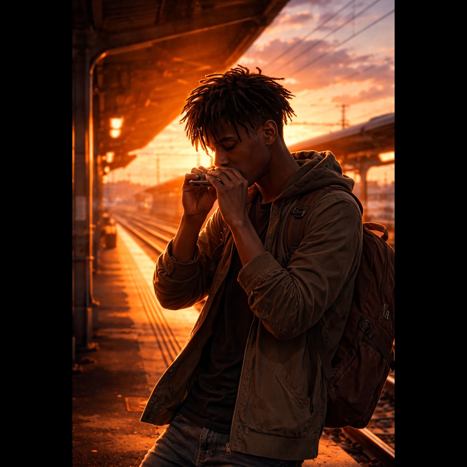 Powerful blues rock song with dominant harmonica lead, Chicago blues harmonica playing aggressive train rhythm shuffle with bending notes and wailing solos, Harmonica imitates a steam train whistle and chugging locomotive rhythm, Raw bar-band energy with electric guitar, bass, and driving drums, Song about a midnight blues train rolling through rain and neon bars, Vintage analog sound, gritty southern blues rock style, 110 BPM shuffle groove, long expressive harmonica solos between verses
