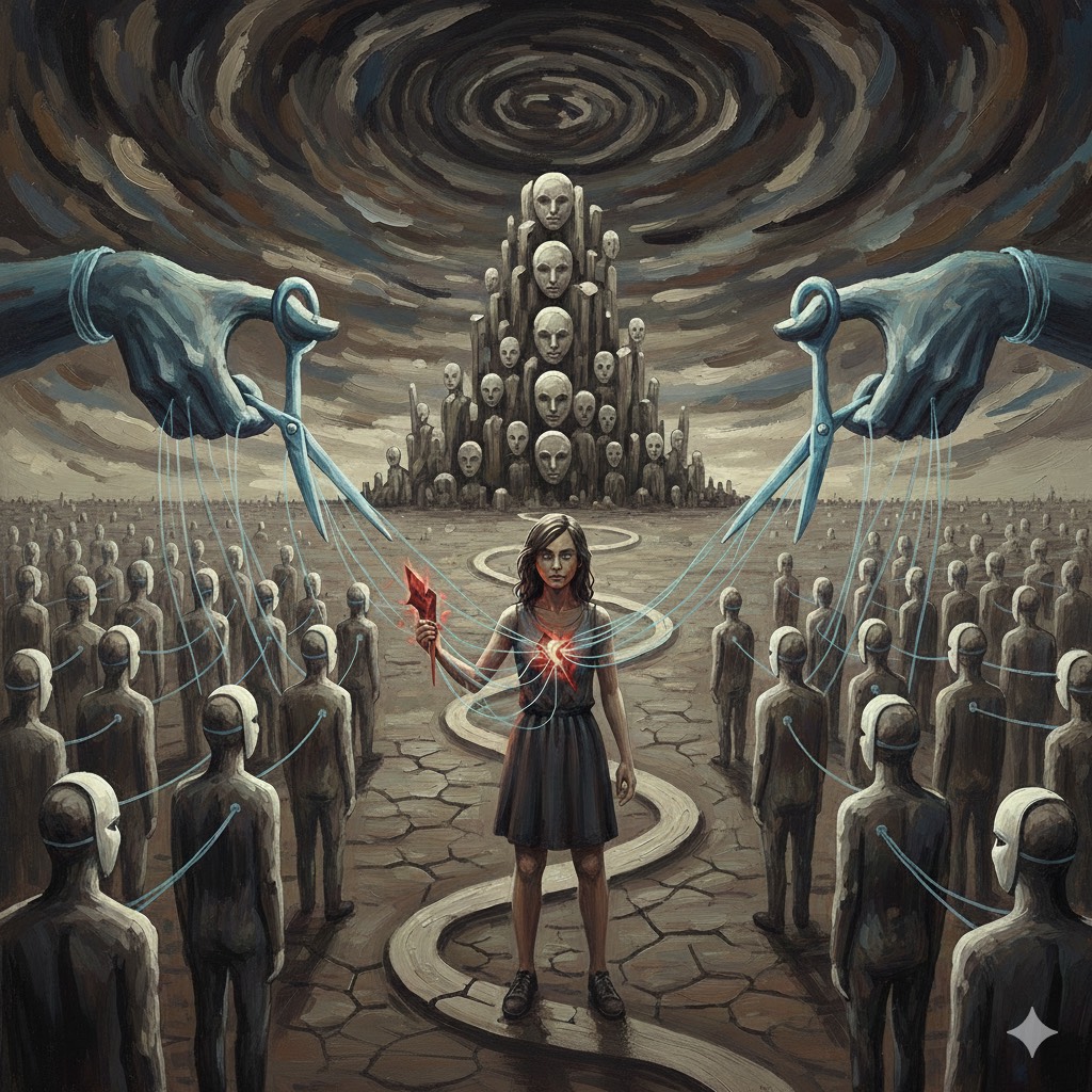 A Japanese alternative rock song with controlled aggression and intellectual tension, Tempo around 135–140 BPM, driving but restrained, Male vocal delivered with precision and emotional discipline, avoiding shouting, English rap sections are sharp, articulate, and cold — spoken-word style, rhythm-focused, almost analytical, Verses are minimal and tight, led by muted guitars and steady drums, Chorus opens up with distorted guitars, not explosive but heavy and deliberate, expressing suppressed resistance rather than rage, Lyrics explore “equality as domination, ” silent control, and rationalized oppression, Bridge reduces instruments to near silence for the rap, then rebuilds carefully into the final chorus, Mood: tense, intelligent, claustrophobic, unresolved