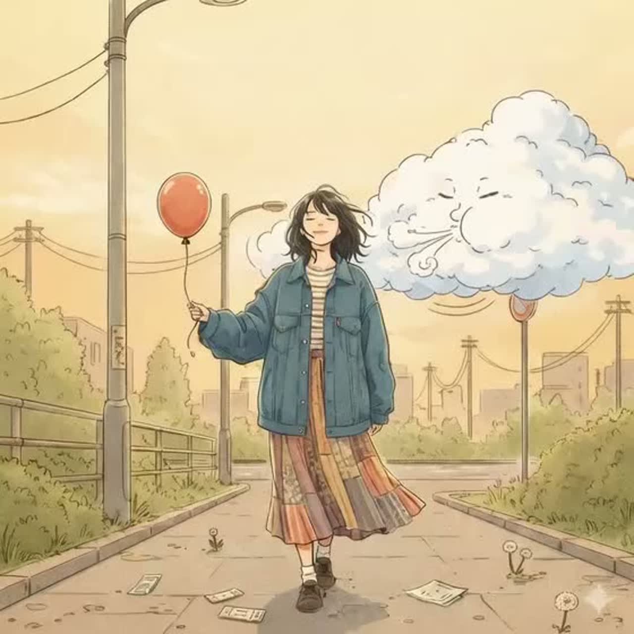 Create a soft, airy indie-pop / J-pop style song with gentle female vocals, The lyrics should convey a young adult’s reflective, slightly self-deprecating thoughts on daily life, blended with light humor and relaxed acceptance, The mood is calm, breezy, and introspective — like walking with a gentle wind, embracing imperfection and small joys, Include playful and sincere moments, lightly ironic reflections, and a sense of quiet hope, Musically, use soft synths, gentle guitar or piano, subtle beats, and a mellow, drifting rhythm, Vocals should feel airy, intimate, and slightly whimsical, expressing both vulnerability and warmth
