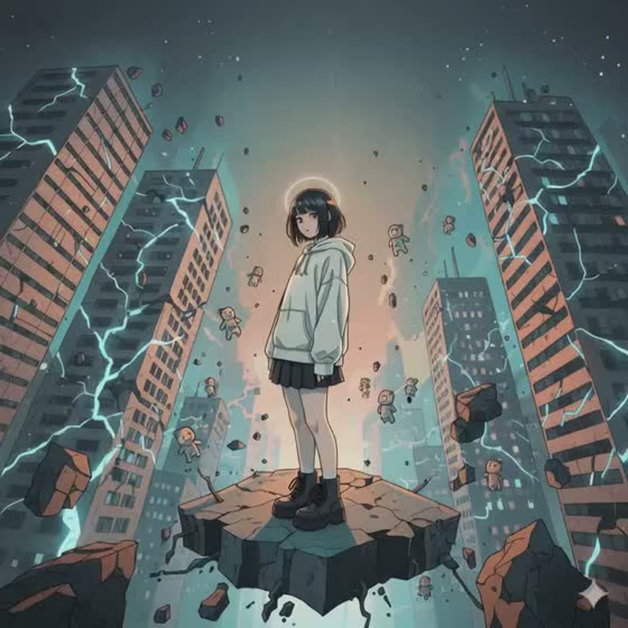 Create a dreamy and edgy J-pop song, Mix soft whisper vocals with bursts of emotion and childlike chaos, Instrumentation: lo-fi beats, light synths, distorted bass, and glitchy percussive sounds, The mood should feel fragile, ironic, and cute-but-dark — balancing sweetness with existential tension, Theme: love and confusion inside a collapsing modern civilization, Tempo: mid-slow, with unexpected rhythm breaks and a surreal atmosphere