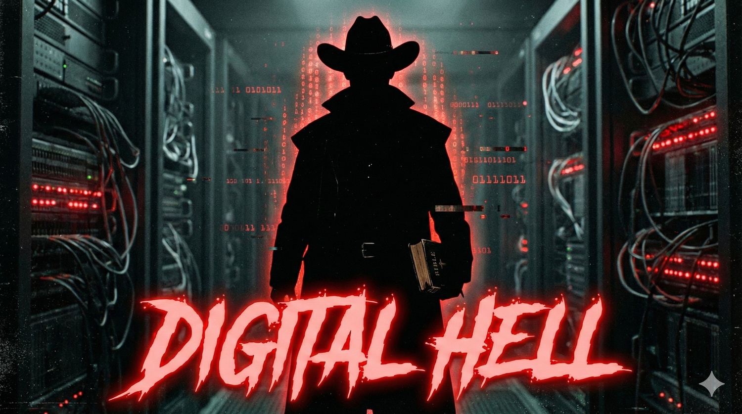 "G":"Southern Gothic Gospel + Industrial Shoegaze + Cyber-Chant", "R":"Stomp-and-Clap + Industrial Lurch; uneven accents; off-grid swing; 6/8 stutter bars; glitch breaks", "I":"Hammond organ (warm); dry/gated handclaps; fuzz guitar wall (chorus); 808 subs; metallic rack/chain hits; distorted choir pad; modem chirps; server-fan drone", "V":"Charismatic guttural Preacher (front) vs hard-autotuned Robotic Choir; Gregorian undertone", "SFX":"LOUD foreground: dial-up handshake + server fans; signal dropouts + tape-stop between sections", "FX":"Bitcrushed; Tape Decay; Signal Loss; stutter edits; hard-tune artifacts; data-glitch", "A":"Sacred, Corrupted, Digital, Ecstatic — Cybernetic Revival"
