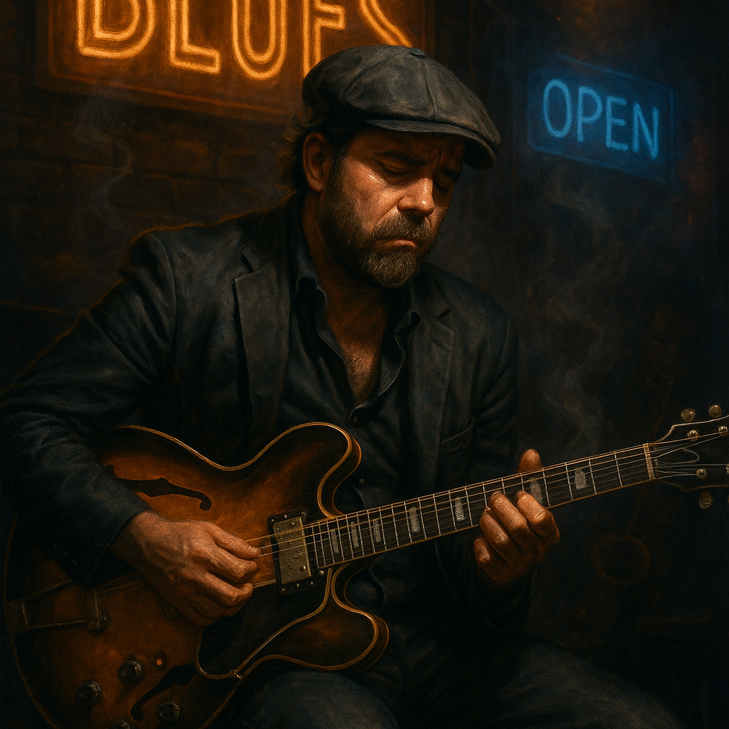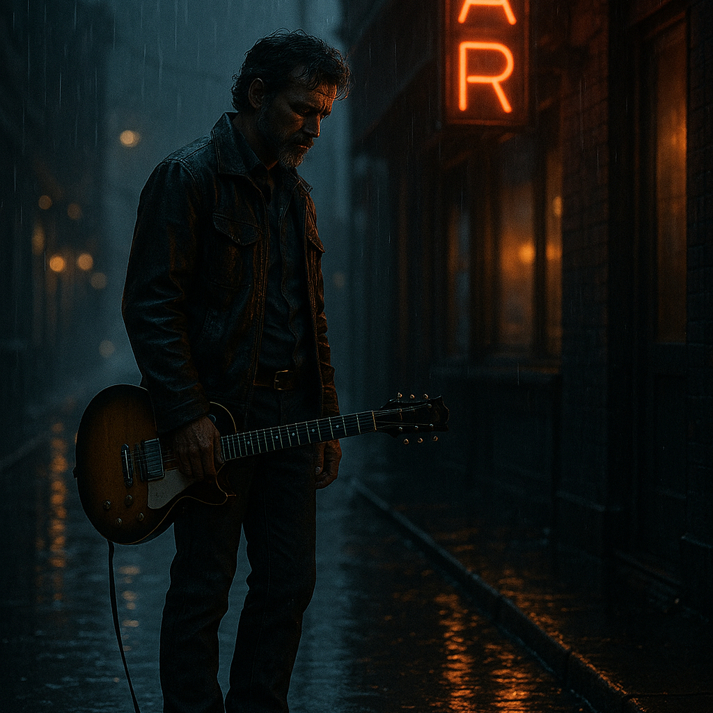 Genre: Classic slow blues ballad, Tempo: ~68 BPM, slow and soulful, Instruments: Expressive electric blues guitar with emotional bends and sustained notes, warm piano chords, upright bass, slow steady drum groove with brushes, subtle Hammond organ for atmosphere, long guitar solo in the middle, Vocals: Deep, soulful male vocal, raspy and emotional, Tender and intimate in verses, powerful and raw in choruses, occasional bluesy ad libs, Mood: Heartbroken, smoky, nostalgic, Evokes late-night blues clubs, rain-soaked streets, and whiskey-soaked memories, Production: Warm, vintage-inspired mix with natural room reverb, wide stereo for a live club feel, emphasis on guitar expressiveness and emotional vocal delivery